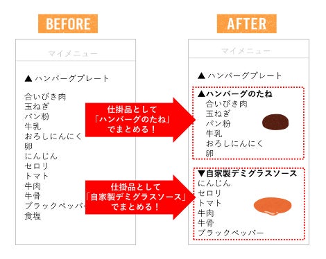 たとえば、ハンバーグのタネ、添え野菜、自家製ソース、自家製ドレッシングで構成される『ハンバーグプレート』というメニューを登録するとします。これまではアレルゲンの管理をする上で、タネやソースなどの区別なくすべての原材料を一つひとつ登録する必要があり、「自家製ソースをかけなければ提供可能な食材なのか」といった仕掛品を考慮した判断がしにくい状態となっていました。