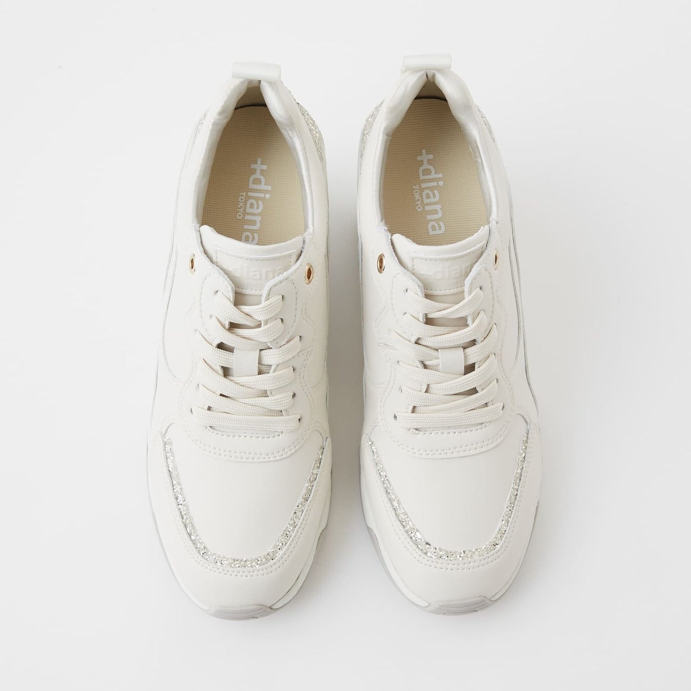 美脚効果と履き心地をを兼ね備えた、+dianaで人気の6cmのヒールアップスニーカー。ハイテク感のあるデザインソールにはロゴ入りメタルヒールキャップでリッチ感をプラスし、スポーティかつ大人っぽく落とし込んだデザインです。旬なボリューム感がありつつも、着こなしになじむよう計算された、すっきりしとたシルエットが人気のポイント。