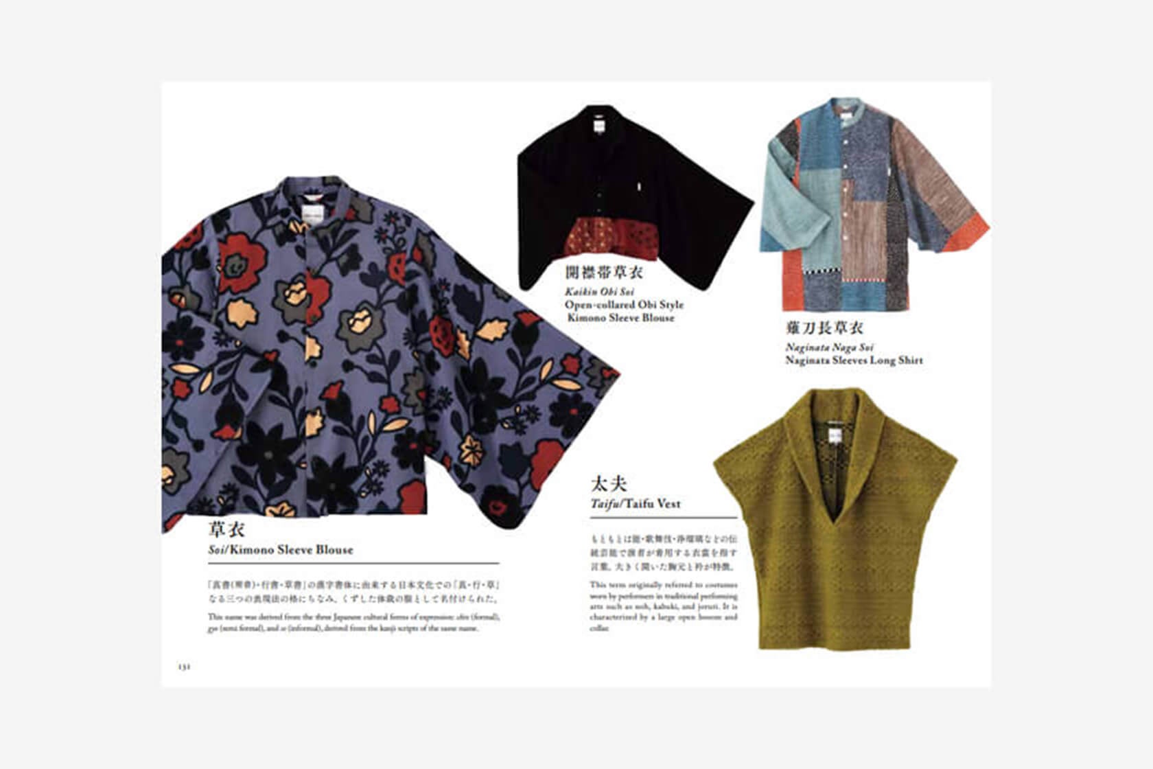 “ 「 新しい日本文化の創造」をコンセプトに掲げるSOU・SOU の商品名には、 着物、ひいては日本文化を想起させるネーミングが多い。他のファッションブランドにはない固有の型と呼び名が特徴だ。この章ではメインとなる商品の型をビジュアルで示しつつ、その型の名称と簡単な解説を紹介していく。 ”
