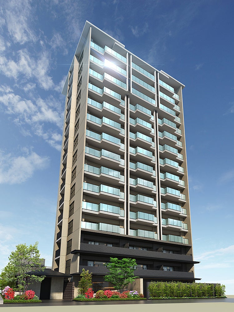 本件は街並みにひときわ高くそびえるシンボリックな15階建。上層階からは開放的な眺望が満喫できます。また、全戸が陽当たりの良い南向きで、角住戸率65%を確保。通風・採光性、独立性を配慮し、設計しました。