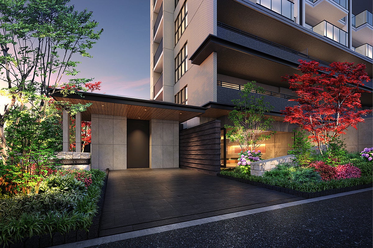 デザインにおいては、自然豊かな「西山との緑の連続性を生かした景観をつくる」という長岡京市の街づくりの方針に則り、この地の歴史・未来・京都らしさを意識しながら建物やランドプランに反映。新たな象徴となるような風景の創造を目指しました。エントランスアプローチの植栽は、「西山」「長岡天神」の自然・樹木を意識して選定。生まれ変わる「天神通り」沿いに新たな風景を演出します。また、長岡名産の竹の立体感も意識した、最大出幅約2.6mの凸型バルコニーは、眺望性・採光性に優れたガラス手摺を採用しました。
