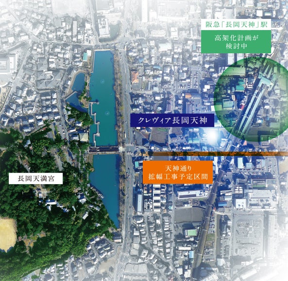 特急停車駅・阪急京都線「長岡天神」駅徒歩4分、快速停車駅・JR京都線「長岡京」駅徒歩11分の2駅2路線が利用可能で、梅田や大阪、京都などの都心直結と交通利便性に優れ、また、歴史ある「長岡天満宮」が鎮座する「長岡天神」駅西側の天神アドレス(天神1丁目)に位置しています。京都府長岡京市で発売された新築分譲マンションにおいて駅徒歩4分以内の15階建ての分譲マンションは約18年※2ぶりとなります。周辺は、スーパーや商店街などの生活施設が充実した長岡京市の中心的なポジションです。
