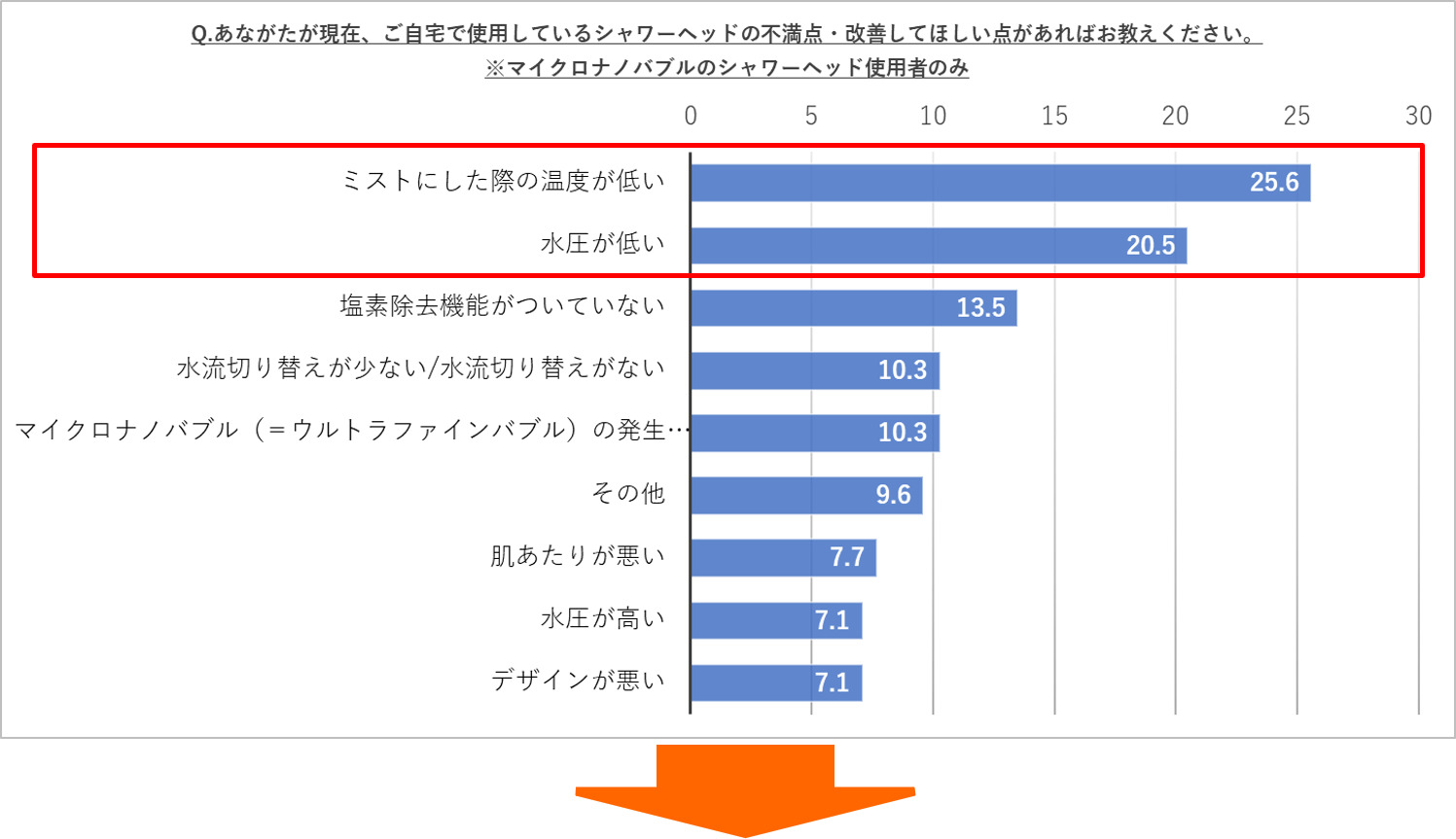 ①「ミストの温度が低い」こと。 次いで、②「水圧が低い」ことが悩みの種だと回答。
