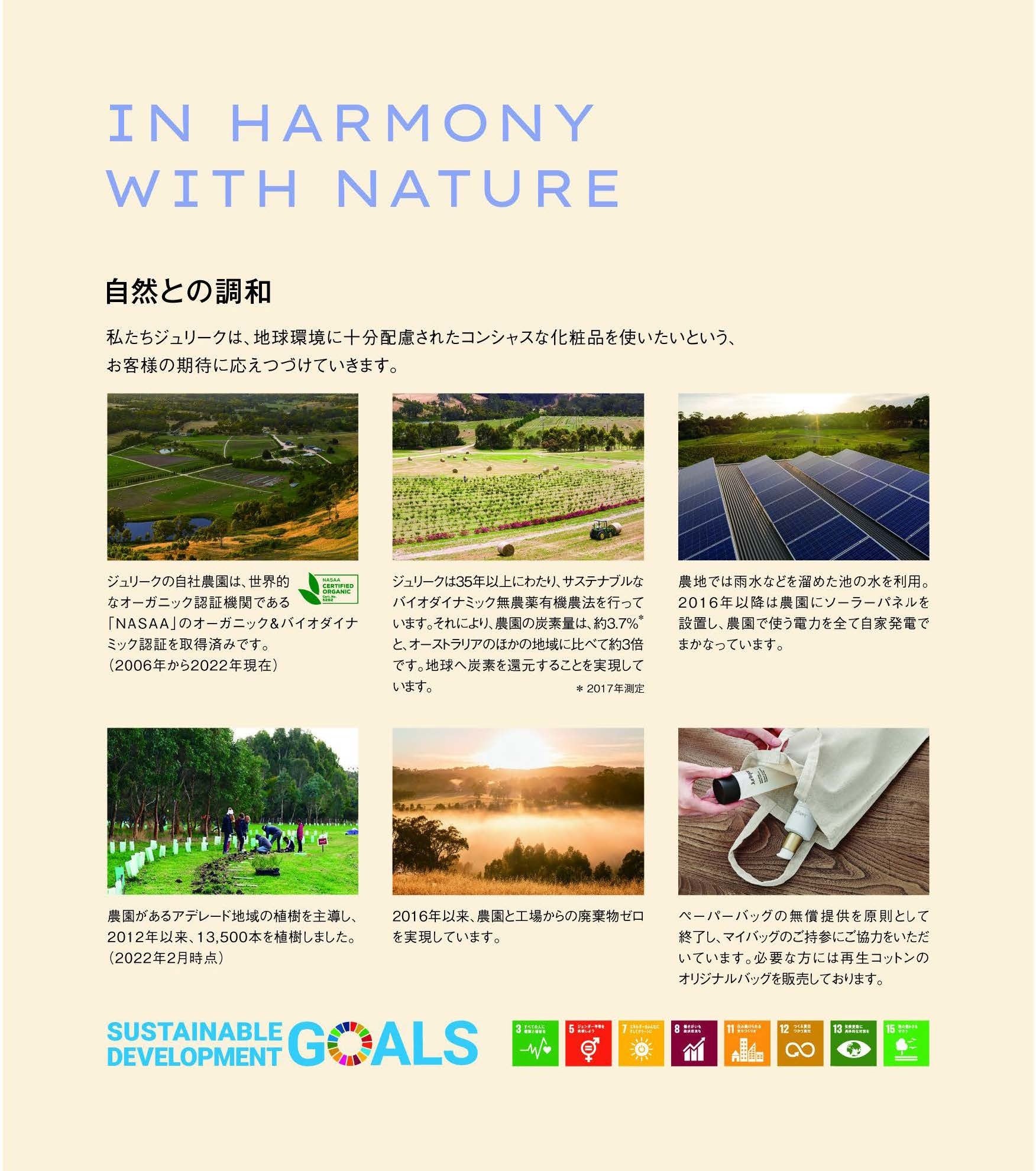 SDGsという言葉がまだ存在しなかった時代から、ジュリークはサステナブルファーム(持続可能な農園の維持)に取り組み、真摯なモノづくりとWell-beingなライフスタイルの実現を目指しています。