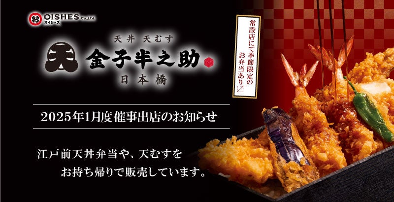 人気飲食店、つけ麺「つじ田」や、「中華そば専門 田中そば店」などをグループで運営する、オイシーズ株式会社(所在地:東京都 千代田区 、代表取締役社長:工藤 智)傘下の株式会社 and RICEが運営するテイクアウト業態の「日本橋 天丼 天むす 金子半之助」は、2025年1月度の期間限定店舗として、今回初出店となるルミネ大船(神奈川県鎌倉市)、JR新木場駅改札内(東京都江東区)を含む東京、神奈川、千葉の計10箇所の百貨店や駅ビル等、各施設の催事場や特設会場へ出店いたします。また、常設店舗では「季節限定商品」を販売しております。