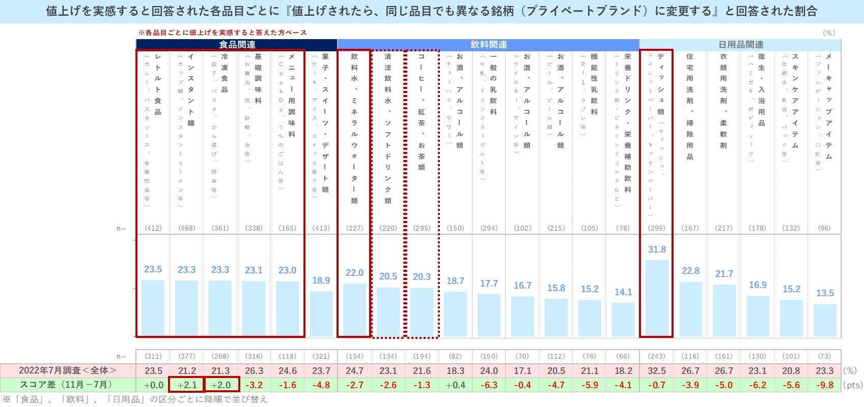 - 値上げを実感すると回答された品目ごとに『値上げされたら、同じ品目でも異なる銘柄(プライベートブランド)に変更する』と回答された割合をみると、食品関連では「菓子・スイーツ・デザート類」以外は2割台で同傾向。飲料関連では「飲料水、ミネラルウォーター類」が22.0%と最も高く、以下「清涼飲料水、