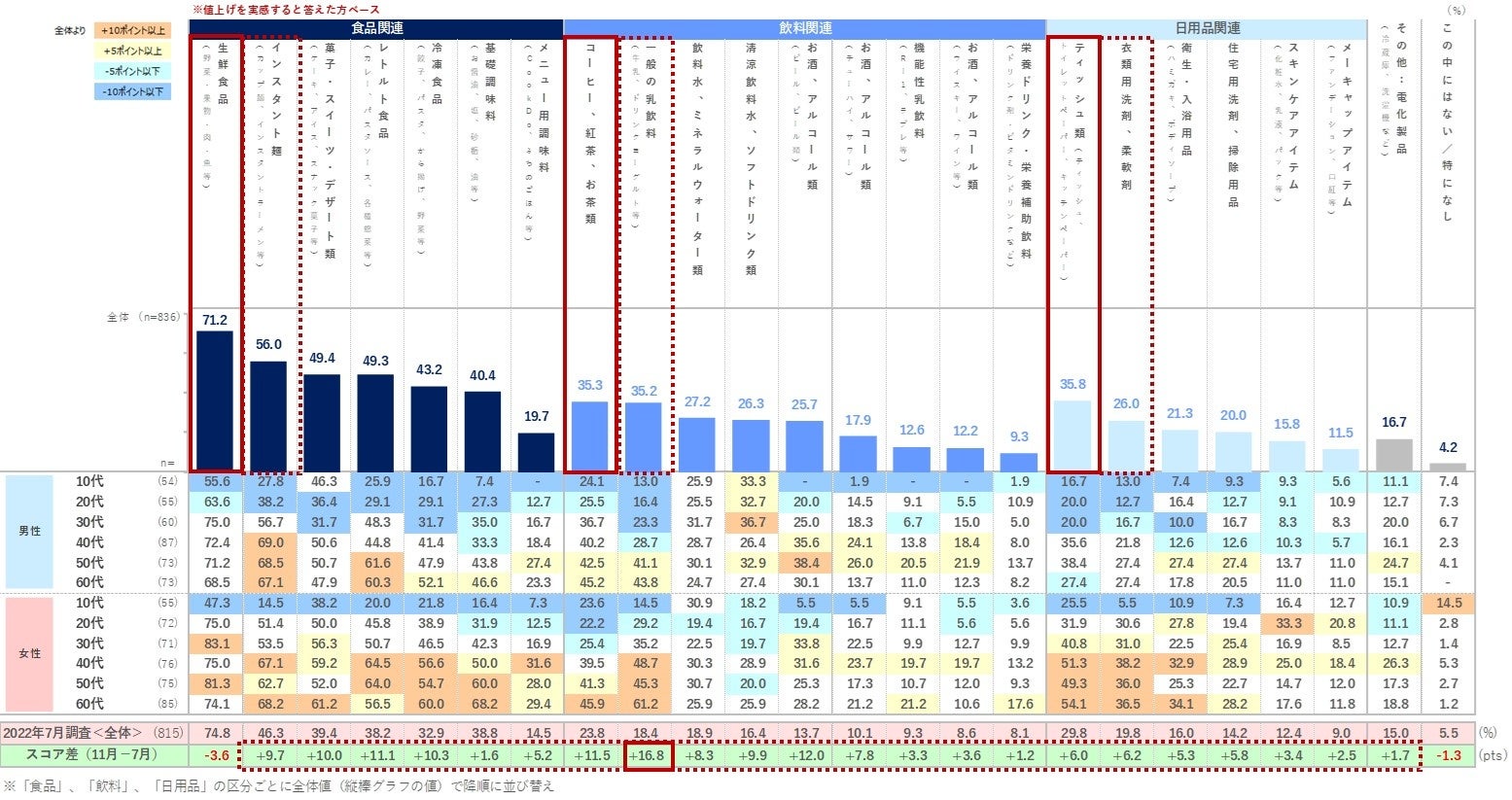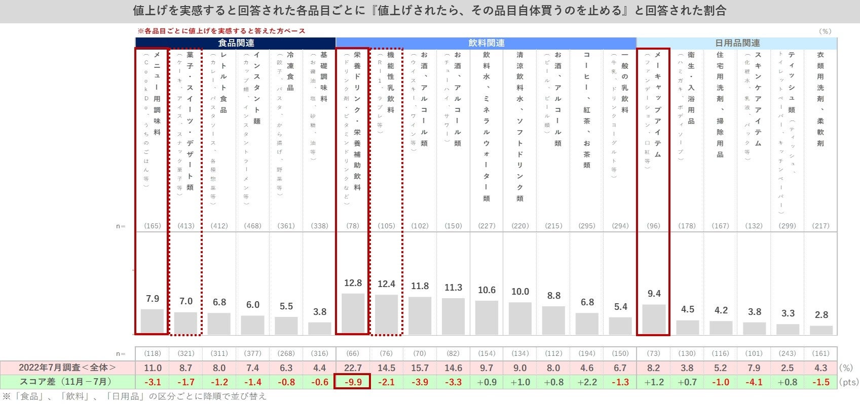 - 値上げを実感すると回答された品目ごとに『値上げされたら、その品目自体買うのを止める』と回答された割合をみると、食品関連では「メニュー用調味料」が7.9%と最も高く「菓子・スイーツ・デザート類」(7.0%) が次いでいる。飲料関連では「栄養ドリンク・栄養補助飲料」が12.8%と最も高く「機能性乳飲料」が12.4%と僅差で続く。日用品関連では「メーキャップアイテム」が9.4%で他の品目を上回る結果となっている。