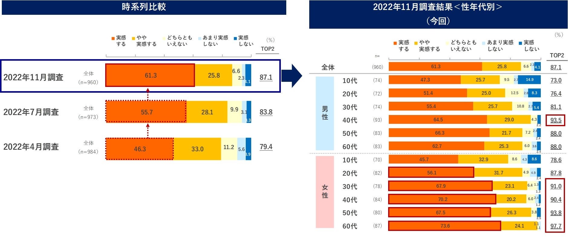 - 日常生活において物やサービスの値上げを実感しているかを確認したところ、11月調査全体では61.3%が「実感する」と回答。時系列でみると、4月以降「実感する」のスコアは上昇傾向が続いており、11月調査は4月調査を15ポイント上回り、消費者心理の悪化が一段と窺える結果結果となっている。
