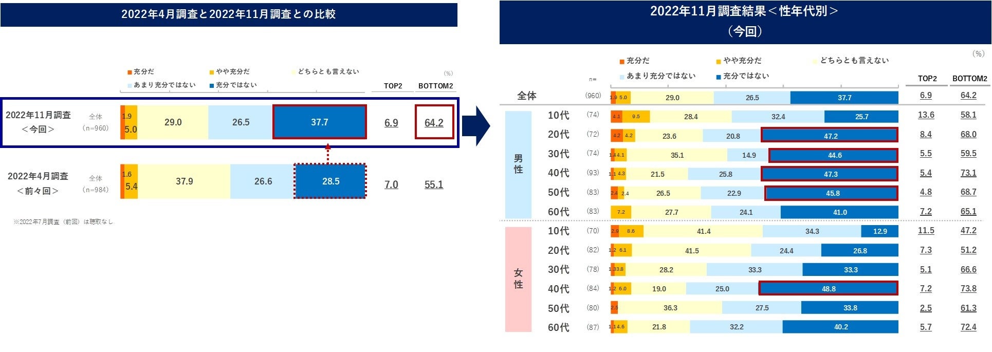 - 現在の物価高騰への政府の対策についての評価をみると、11月調査全体では「充分ではない」が37.7%となっており、4月の調査結果を9.2ポイント上回る結果となっている。なお、BOTTOM2(充分ではない+あまり充分ではない)をみると、6割を超える結果となっている。