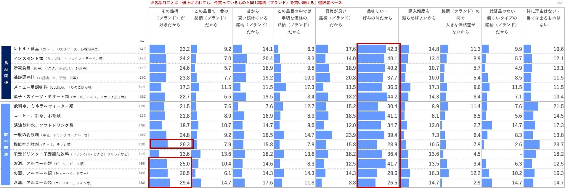 - 値上げされても同じ銘柄(ブランド)を買い続けると回答された品目について、その理由を確認したところ食品関連、飲料関連のすべての品目で「美味しい・好みの味だから」が最も高くなっている。なお『お酒、アルコール類』(種類を問わず)と『機能性乳飲料』では「その銘柄(ブランド)が好きだから」が2割半ば~後半となっており、他の品目をやや上回る結果となっている。