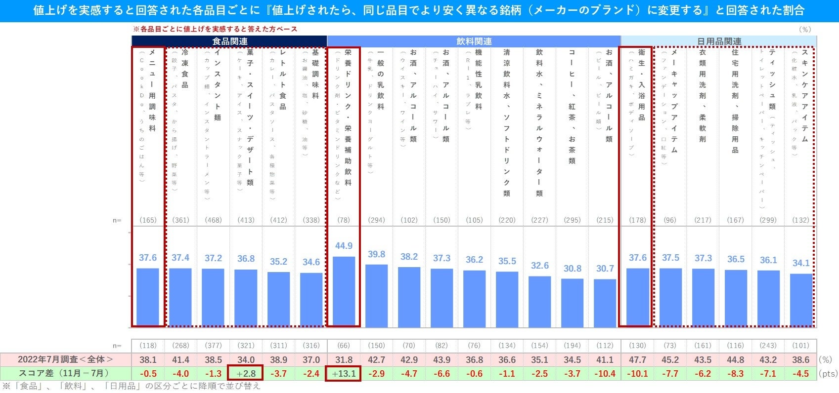 値上げを実感すると回答された品目ごとに『値上げされたら、同じ品目でより安くなる銘柄(メーカーのブランド)に変更する』と回答された割合をみると、食品関連では「メニュー用調味料」が37.6%と最も高いが、他品目もほぼ横並びとなっている。飲料関連では「栄養ドリンク・栄養補助飲料」が44.9%と最も高く、他の品目を5ポイント以上上回る。日用品関連では「衛生・入浴用品」が37.6%と最も高いが、他品目もほぼ横並びとなっている。