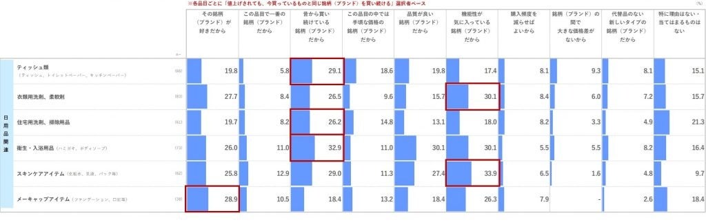 - 値上げされても同じ銘柄(ブランド)を買い続けると回答された日用品関連の品目について、その理由を確認したところ『ティッシュ類』『住宅用洗剤、掃除用品』、『衛生・入浴用品』では「昔から買い続けている銘柄(ブランド)だから」が、『衣類用洗剤、柔軟剤』『スキンケアアイテム』では「機能性が気に入っている銘柄(ブランド)だから」が、『メーキャップアイテム』では「その銘柄(ブランド)が好きだから」が最も高くなっており、品目による違いが顕著となっている。