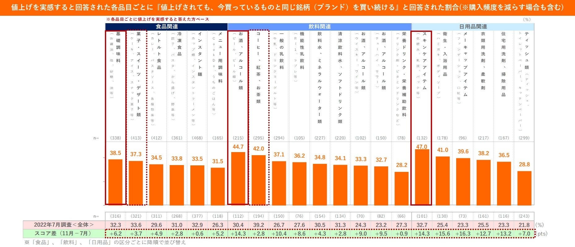 - 値上げを実感すると回答された品目ごとに、『値上げされても、今買っているものと同じ銘柄(ブランド)を買い続ける』と回答された割合をみると、食品関連では「基礎調味料」が38.5%と最も高く「菓子・スイーツ・デザート類」(37.3%) が続く。飲料関連では「お酒、アルコール類」が44.7%と最も高く「コーヒー、紅茶、お茶類」(42.0%)が次いでいる。日用品関連では「スキンケアアイテム」が47.0%で他の品目を5ポイント以上上回る。