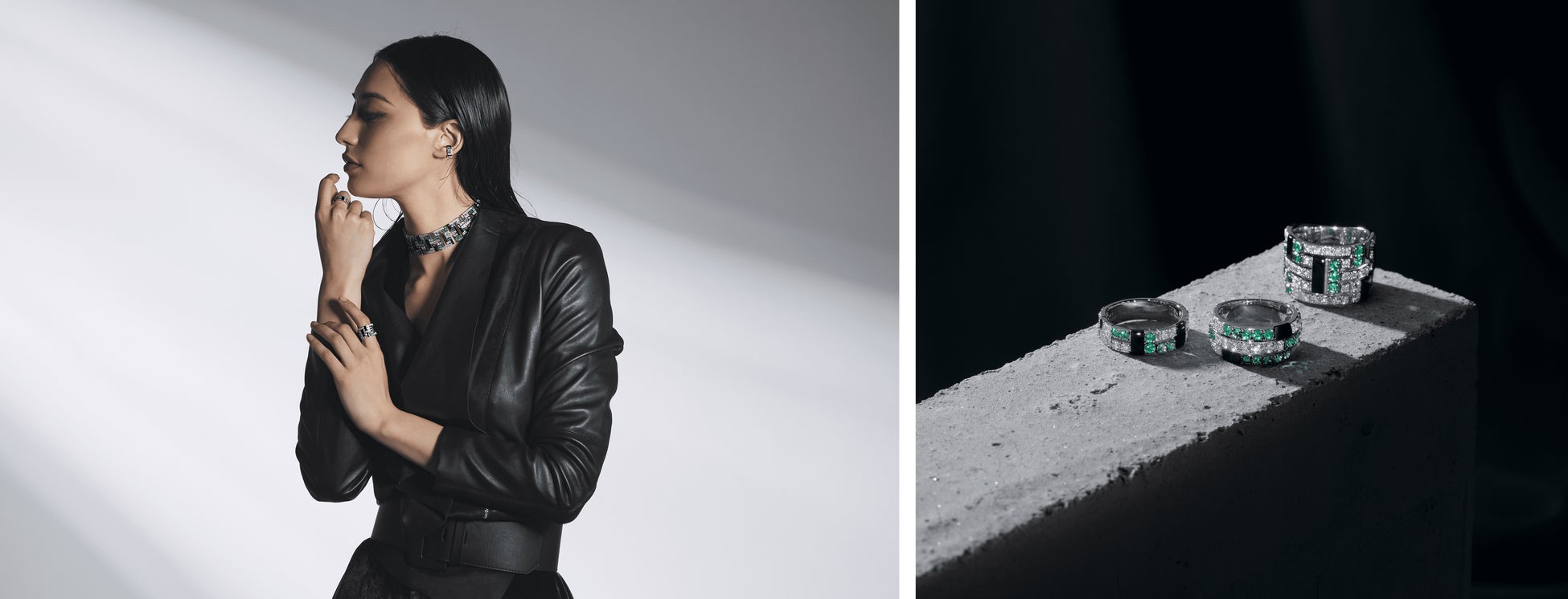 また、2023年秋に発売を開始した、「kagayoi」の最新作「HANAMONYO Collection “ROCK YOU”」の新ビジュアルも7月より解禁いたしました。魅惑的なエメラルドの緑とオニキスの黒の絶えることない様が、シンプルを極める工字繋ぎ(こうじつなぎ)文様と重なり、その美しさと内なる強さが煌(きら)めく「HANAMONYO Collection “ROCK YOU”」。新ビジュアルでは、クールなブラックドレスとフェミニンなページドレスという対照的な二つのコーディネートの中で、アクセントとしてジュエリーが美しく存在感を発揮するスタイルを表現しています。ぜひこの機会にご注目ください。