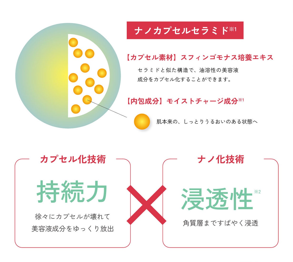 ※1 カプセル素材:スフィンゴモナス培養エキス、内包成分:アッケシソウエキス、クダモノトケイソウ種子油、セラミドNP、セラミドNG、セラミドAP(保湿成分)※2 角質層まで
