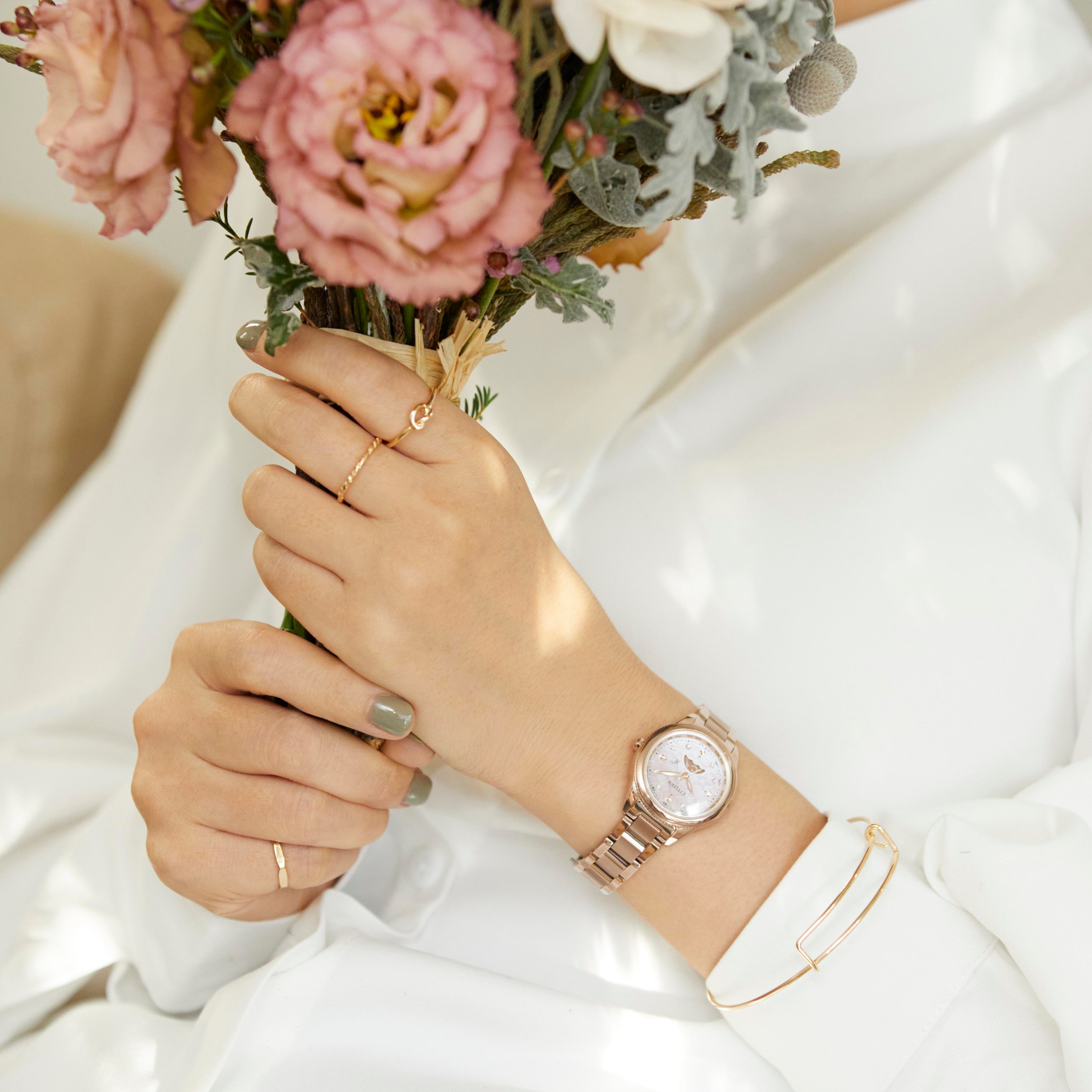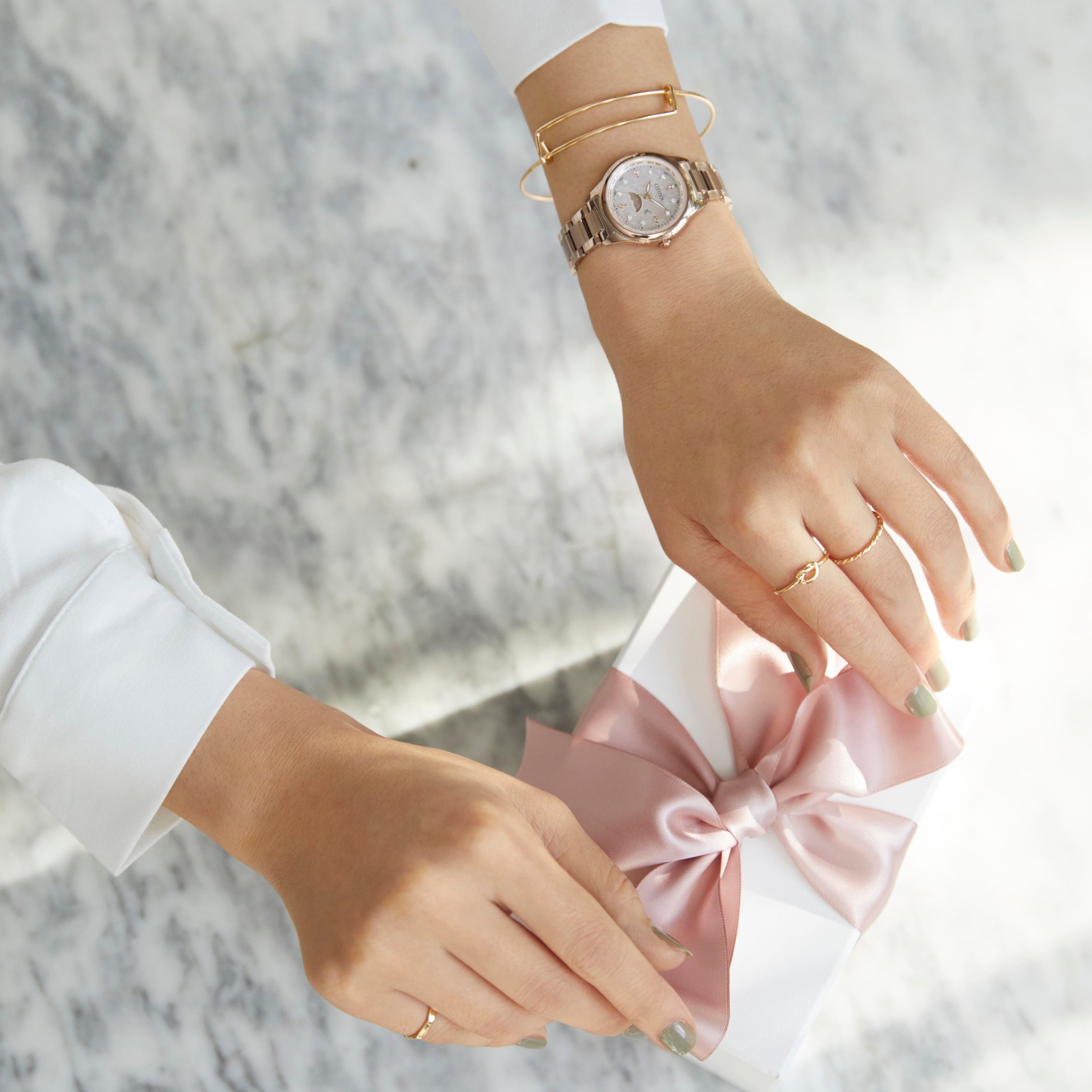 ※3サクラピンク(R):女性の肌を美しく魅せ、さらにキズから守るデュラテクト「サクラピンク(R)」。腕時計の表面をキズから守る表面硬化技術 デュラテクトは、シルバー、ゴールド、ピンクゴールドなど幅広い色彩表現が可能なシチズン独自の技術です。2016年、クロスシーを身につける女性にふさわしいデュラテクトを追究し、「サクラピンク(R)」を開発しました。ローズゴールドでもピンクゴールドでもない、柔らかな色味と輝きで、キズつかない「強さ」とずっと続く「美しさ」を兼ね備え、登場以来女性に高い支持をいただいています。また、デュラテクト「サクラピンク(R)」は、SIAA(抗菌製品技術協議会)が定める試験方法による抗菌性能基準をクリアし、SIAA認証を取得しています。