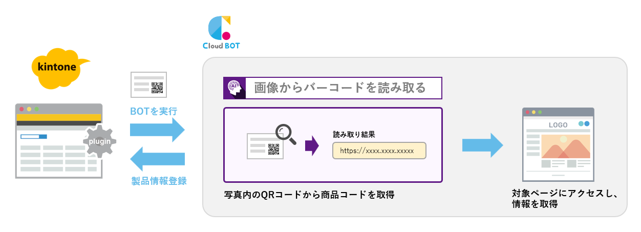 “画像内のQRコードからURLを読み取り、製品ページにアクセスし必要な情報を取得する“という一連の流れをBOTで自動化できます。