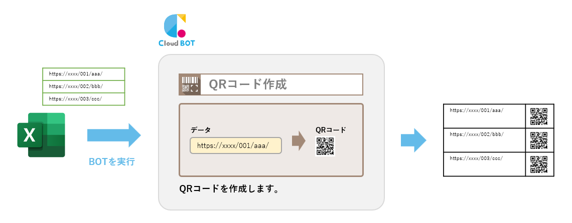 Excelに記載されたURLをクラウドBOTにインポートし、繰り返し処理を用いてQRコードを一括生成する事ができます。