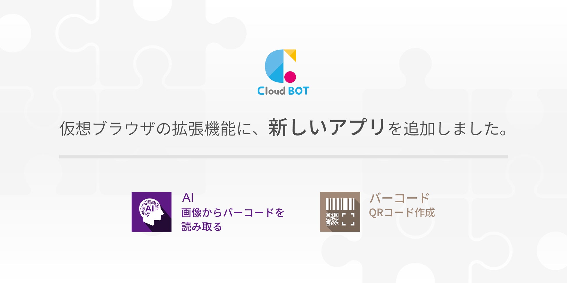 クラウドBOTは、仮想ブラウザを自動操作する事で業務の自動化やシステム連携を実現するクラウド型RPAです。今回、拡張機能として新たに「画像からバーコードを読み取る」、「QRコード作成」という2つのアプリを追加しました。