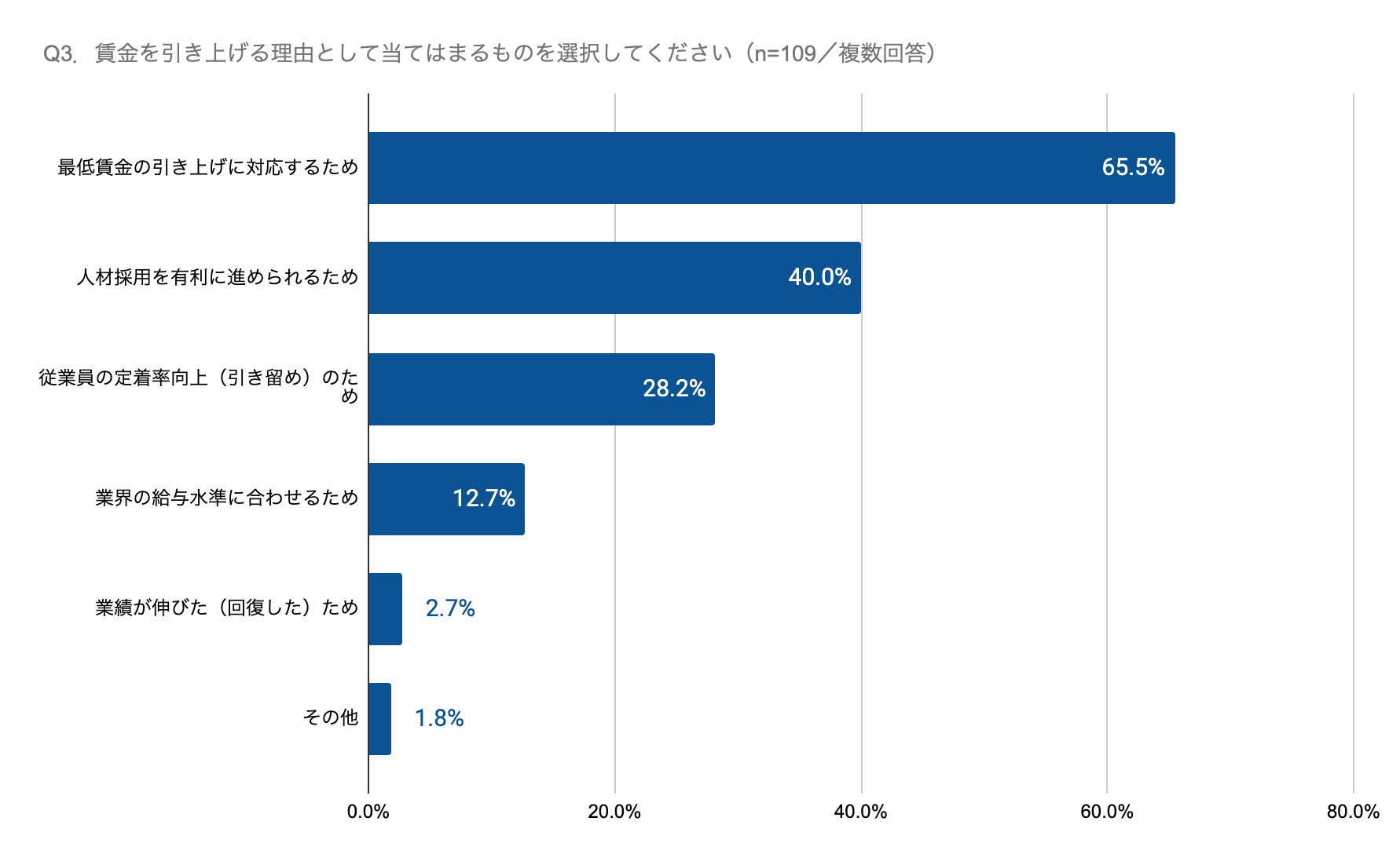 理由としてもっとも多かったのは、「最低賃金の引き上げに対応するため」。引き上げを予定している事業所の65.5%が選択しています。2位は「人材採用を有利に進められるため」、3位には「従業員の定着率向上(引き留め)のため」が続きました。人材確保に向けた積極的な賃上げを行った事業所も少なくないことが分かります。