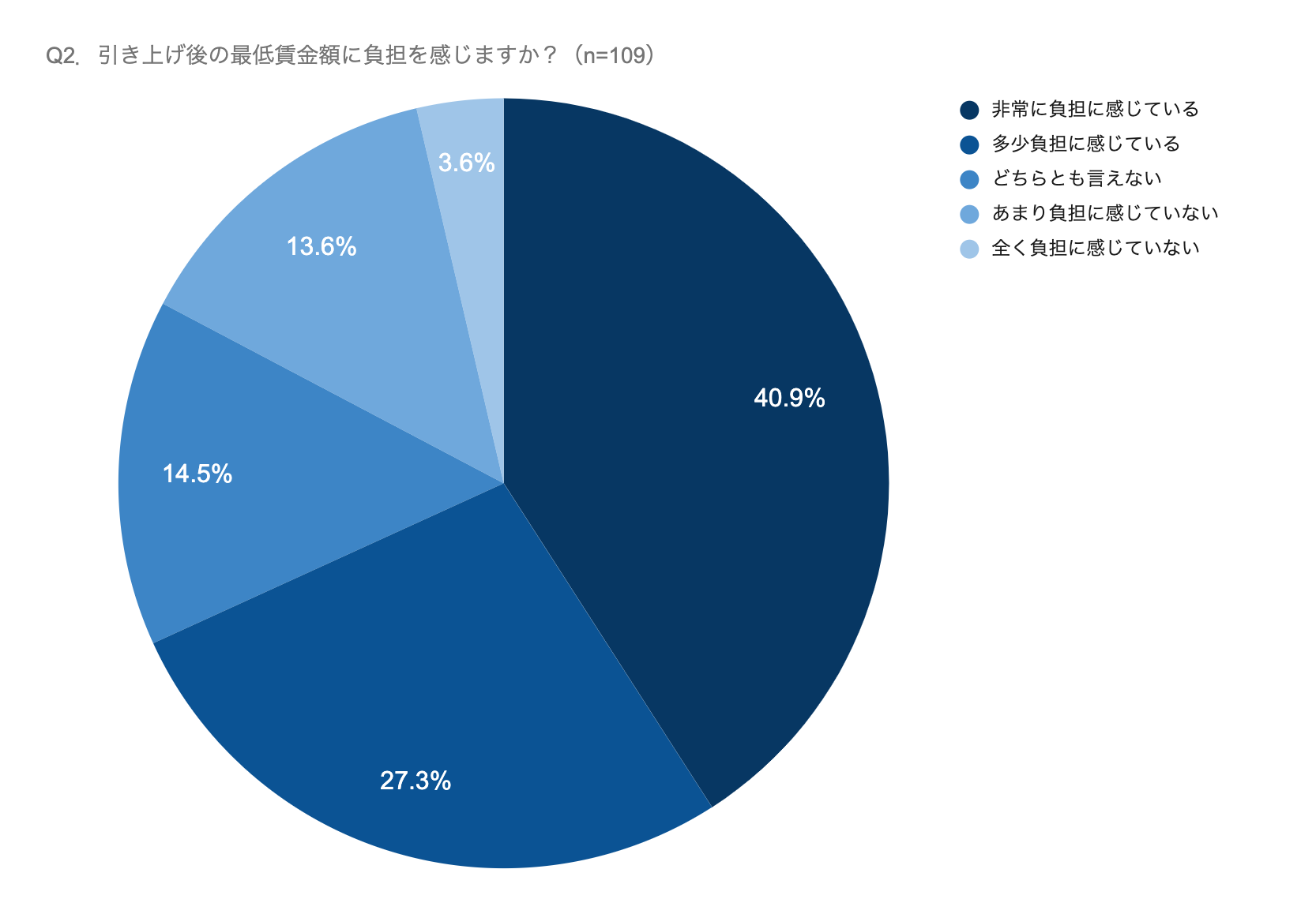 続いて、Q1で「賃金を引き上げる予定」と回答した事業所へ(n=109)、引き上げ後の最低賃金額に負担を感じるかどうかについて質問したところ、「負担に感じている」が68.2%に上りました。内訳は、「非常に負担に感じている」が、40.9%。「多少負担に感じている」が27.3%です。