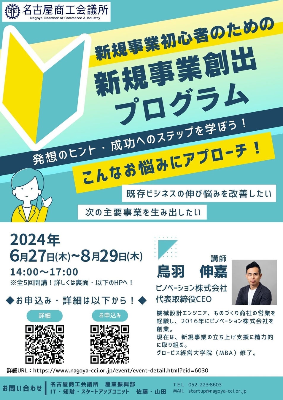 新規事業開発の伴走サービス「アウトレ」の提供をしている、ピノベーション株式会社(本社:愛知県名古屋市、代表取締役:鳥羽 伸嘉)は、名古屋商工会議所が主催する、「新規事業初心者のための新規事業創出プログラム」の講師を務めます。