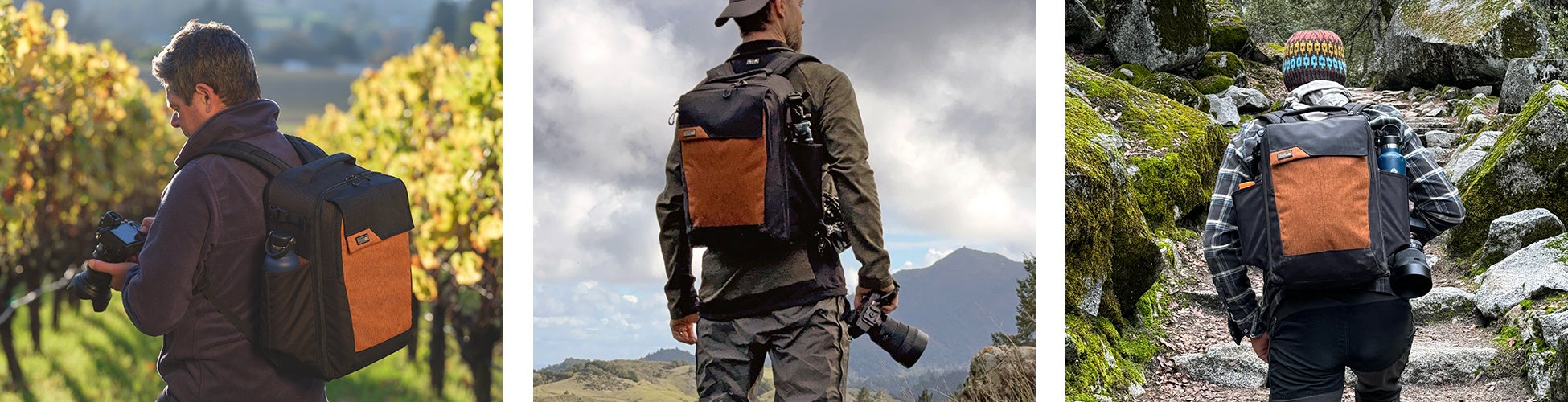 大手カメラケースメーカーで何年にも渡って製品デザインの経験を持つDougとMikeが練り上げた製品を、DeanneとKurtが厳しいフィールドテストに持ち出して改良点を指摘する、という過程で生み出される製品は、どれも野心的で、かつ洗練された 使い心地を誇ります。さらにバッグ全体の頑丈さと細部まで 行き届いた工夫により、撮影現場での頼れるパートナーとなり ます。