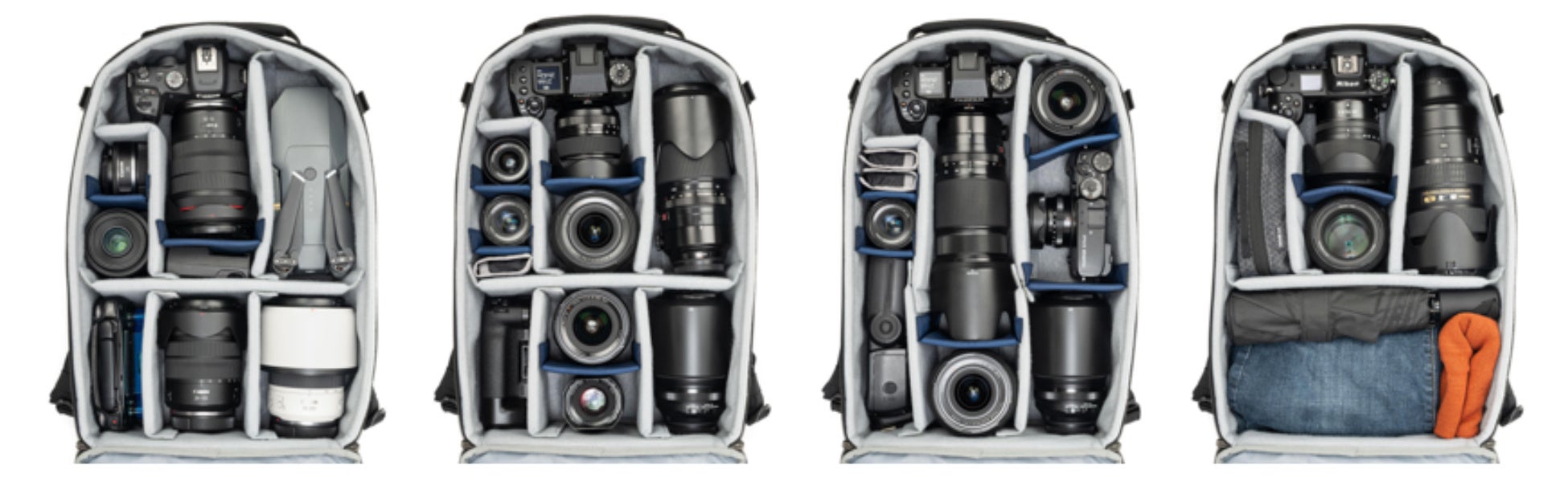 ミラーレスカメラ1台、4-6本のレンズ、アクセサリー、または70-200mm F2.8 を装着したフード付きミラーレスカメラ1台、レンズ数本、アクセサリーなどを収納可能です。