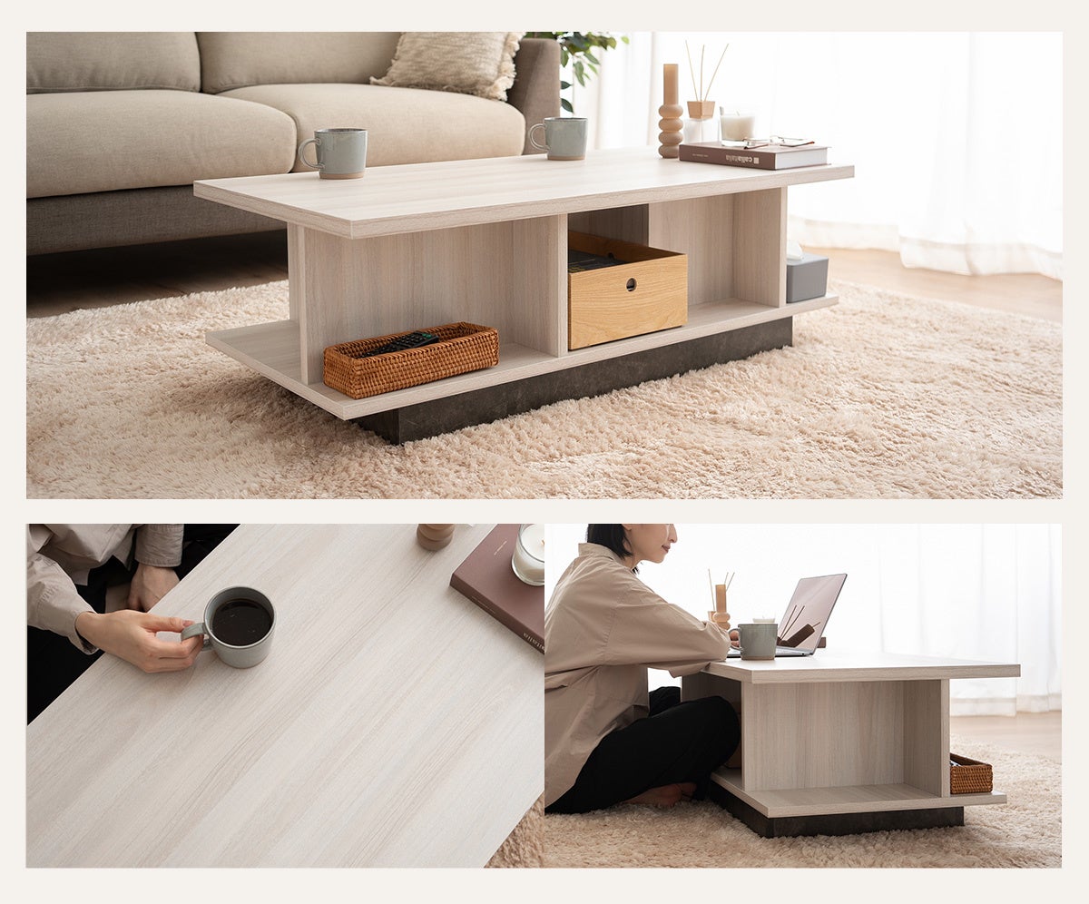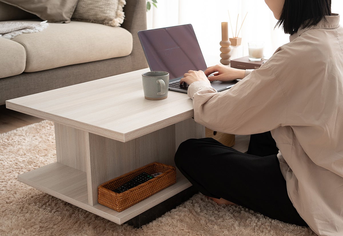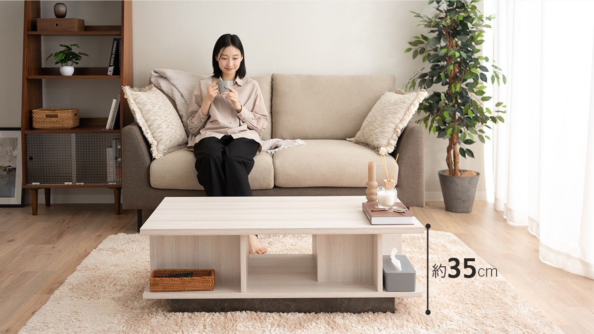 高さ約35cmのローテーブルで開放的な空間を演出。収納、食事やお茶、読書など様々なシーンで使えるので、他のテーブルや収納家具を置く必要がありません。