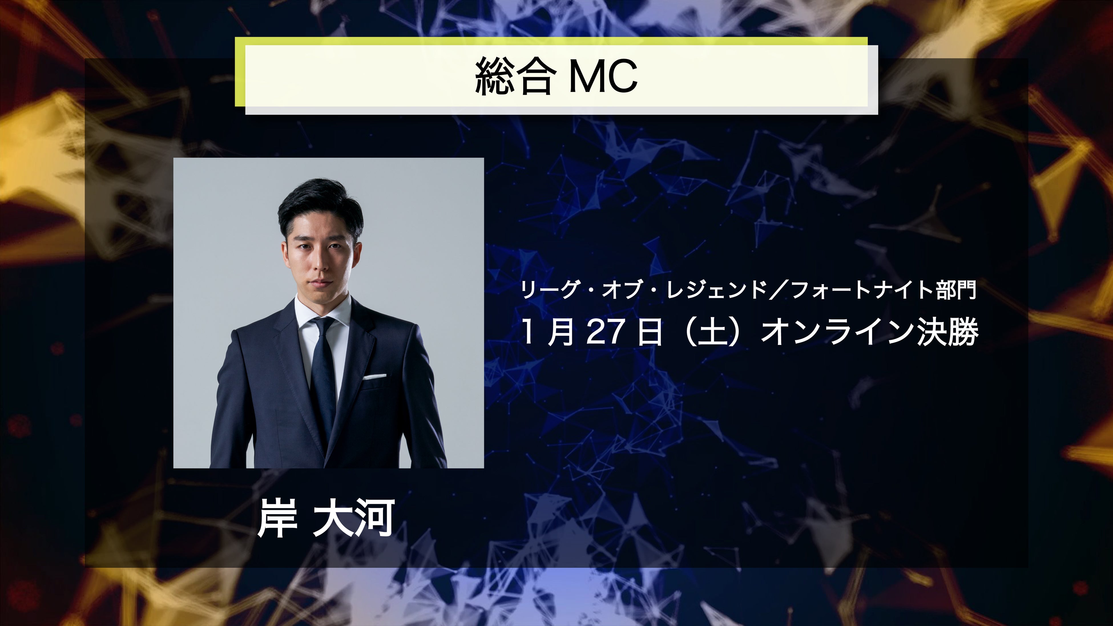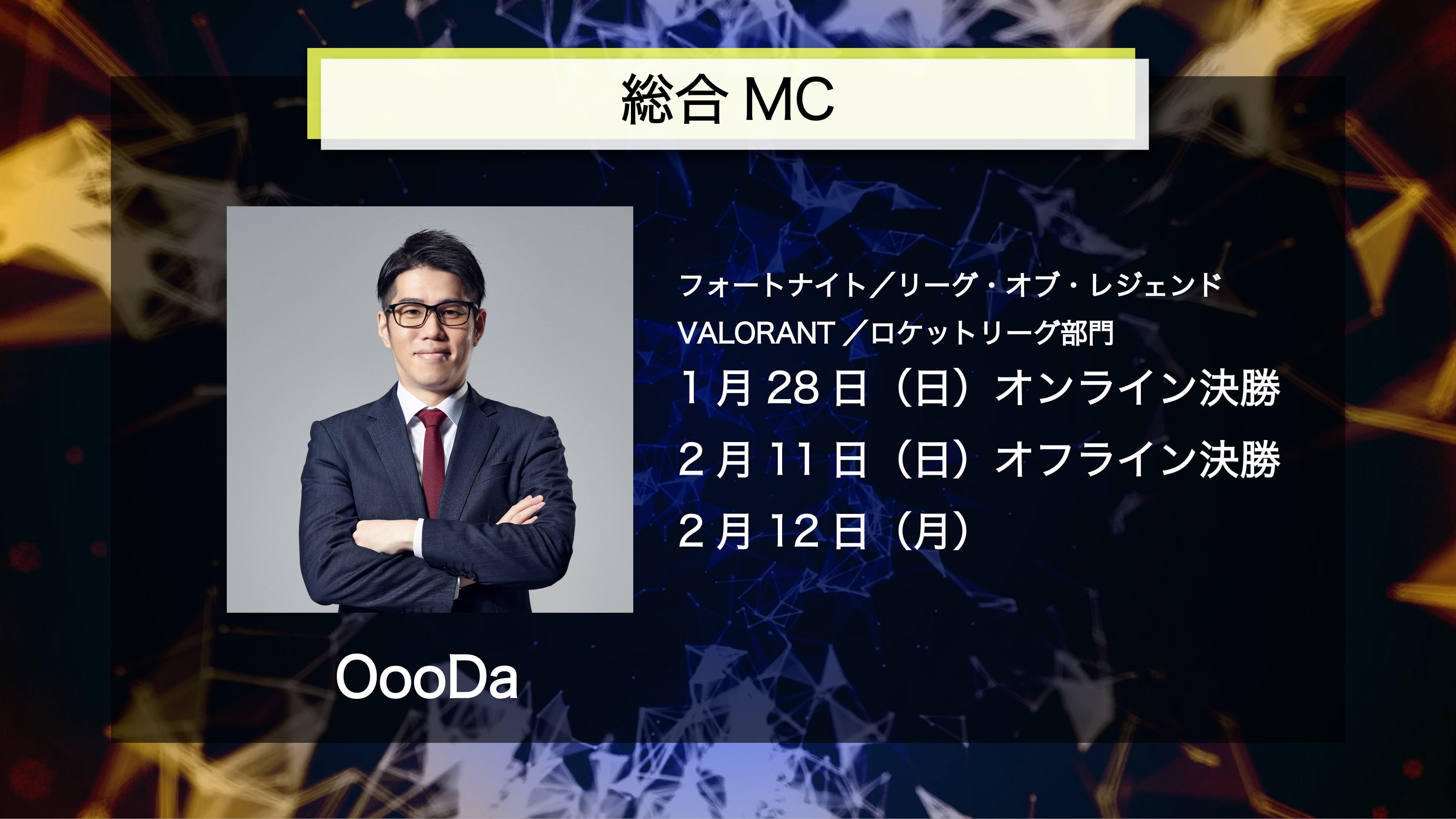 決勝は、1月27日(土)・28日(日)はオンライン、2月11日(日)・12日(月)は、ラフォーレミュージアム原宿(東京都渋谷区)にてオフラインで開催します。4日間の試合はすべて大会公式YouTube、Twitch、大会公式Xにて、無料ライブ配信を行ないます。本大会の公式応援リーダー「ぶいすぽっ!」胡桃のあさんも出演が決定しており、ご本人による応援コメントの紹介や、大会を盛り上げる注目の配信コンテンツも予定しています。総合MCに岸大河さん、OooDaさん。実況には大和周平さん、kokkenさん、eyesさんを迎え、熱い大会をリアルタイムでお届け。そのほか多彩な出演者が決定しており、詳細は本リリース内の「出演者情報」からご確認ください。