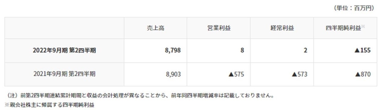 2022年9月期 第2四半期連結業績は、売上高8,798百万円、営業利益8百万円、経常利益2百万円、四半期純損失155百万円となりました。