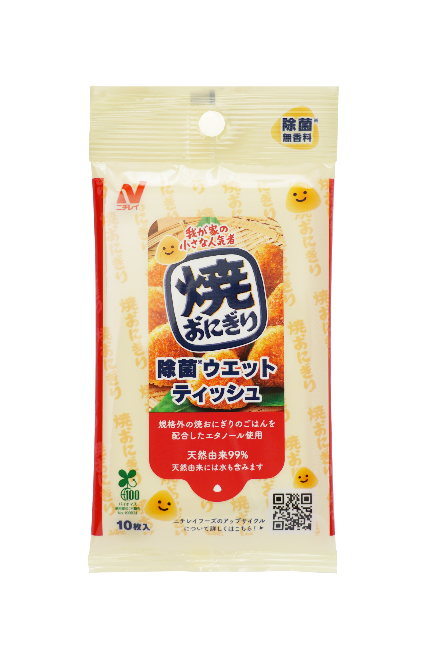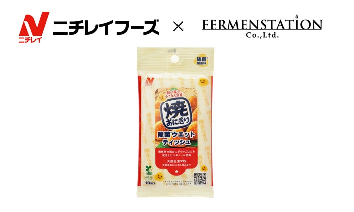 独自の発酵技術で未利用資源を再生・循環させる社会を構築する研究開発型スタートアップの株式会社ファーメンステーション(本社:東京都、代表取締役:酒井 里奈、以下 ファーメンステーション)と株式会社ニチレイフーズ(本社:東京都、代表取締役社長:竹永 雅彦泰、以下 ニチレイフーズ)は、持続可能な社会に向けたサーキュラエコノミー(循環型経済)の実現を目指した未利用資源の再生・循環パートナーシップの取り組みとして、ニチレイフーズの冷凍食品「焼おにぎり10個入」の製造過程で排出される規格外のごはんを原料に、発酵アルコール(エタノール)を精製し、そのアップサイクル(※)されたエタノールを配合したオリジナルの『「焼おにぎり」除菌ウエットティッシュ』を開発いたしました。