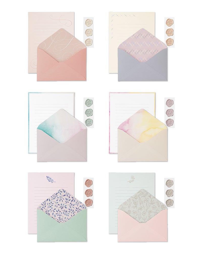 価格:495円(税込)/種類:6種(カリグラフィ、スパイラル、ブルーピンク、パープルイエロー、ボタニカル、フラワー)/内容:封筒3枚、便箋6枚、シール3枚/製品寸法:封筒148×98mm、便箋138×182mm
