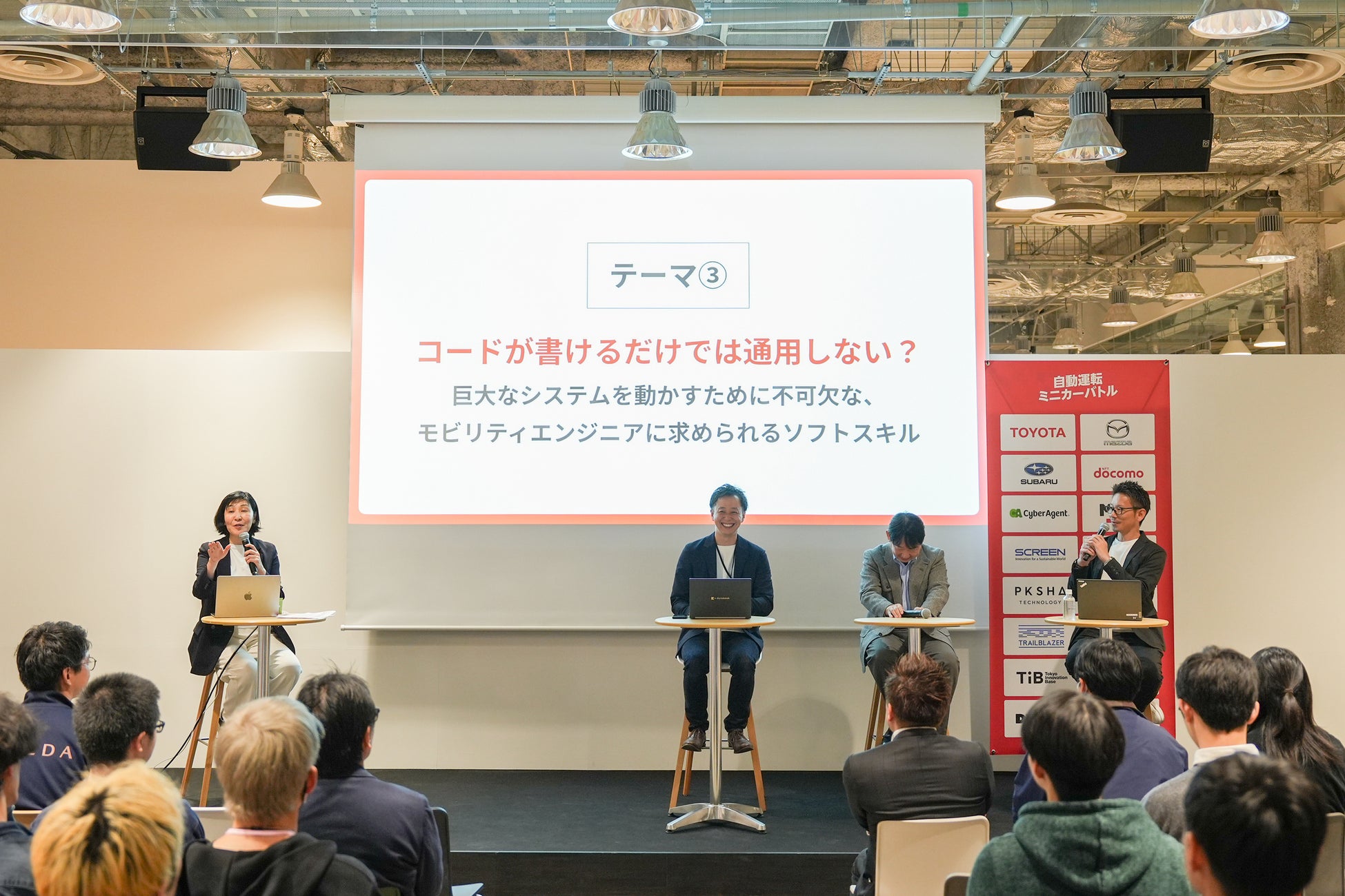 イベントの中ではトヨタ自動車株式会社、マツダ株式会社、スマートホールディングス 4th.ai代表 スマートインプリメント株式会社が登壇し、これからの自動車業界のソフトウェアエンジニアに求められるスキルなどについてパネルディスカッションを行いました。