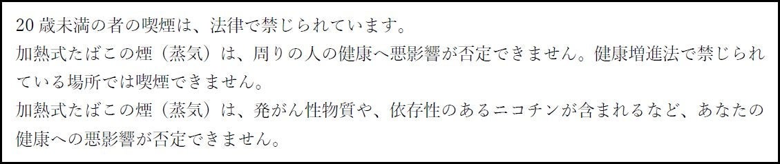 BATグループでは、たばこ製品のマーケティングを適切に実施するために国際的な自主規準を設定しています。そのため消費者に対するたばこ製品に関するすべてのコミュニケーションには、20歳未満の方へのコミュニケーションをお控えいただくとともに、「喫煙と健康に関する注意文言」を表示することを関係各位にお願いしております。加熱式たばこに関しては、記事掲載していただく際には、「健康に関する注意文言」が表示されるようご配慮いただきたく存じます。ご協力の程、何卒よろしくお願い申し上げます。