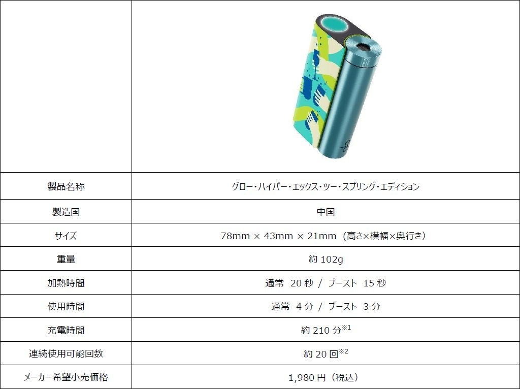 また、3月27日(月)の一般販売開始に先駆けて、3月20日(月)11:00から3月26日(日)23:59までの期間、glo(TM)のシルバー・ゴールドメンバー限定で、glo & VELOオフィシャルオンラインショップにおける先行販売をご案内いたします。先着1,500名様には「glo(TM) hyper X2 スプリング・エディション」のデザインをあしらった今春限定のスペシャルボックスに新製品と特典を封入してご提供します。お一人様1台までの購入となります。