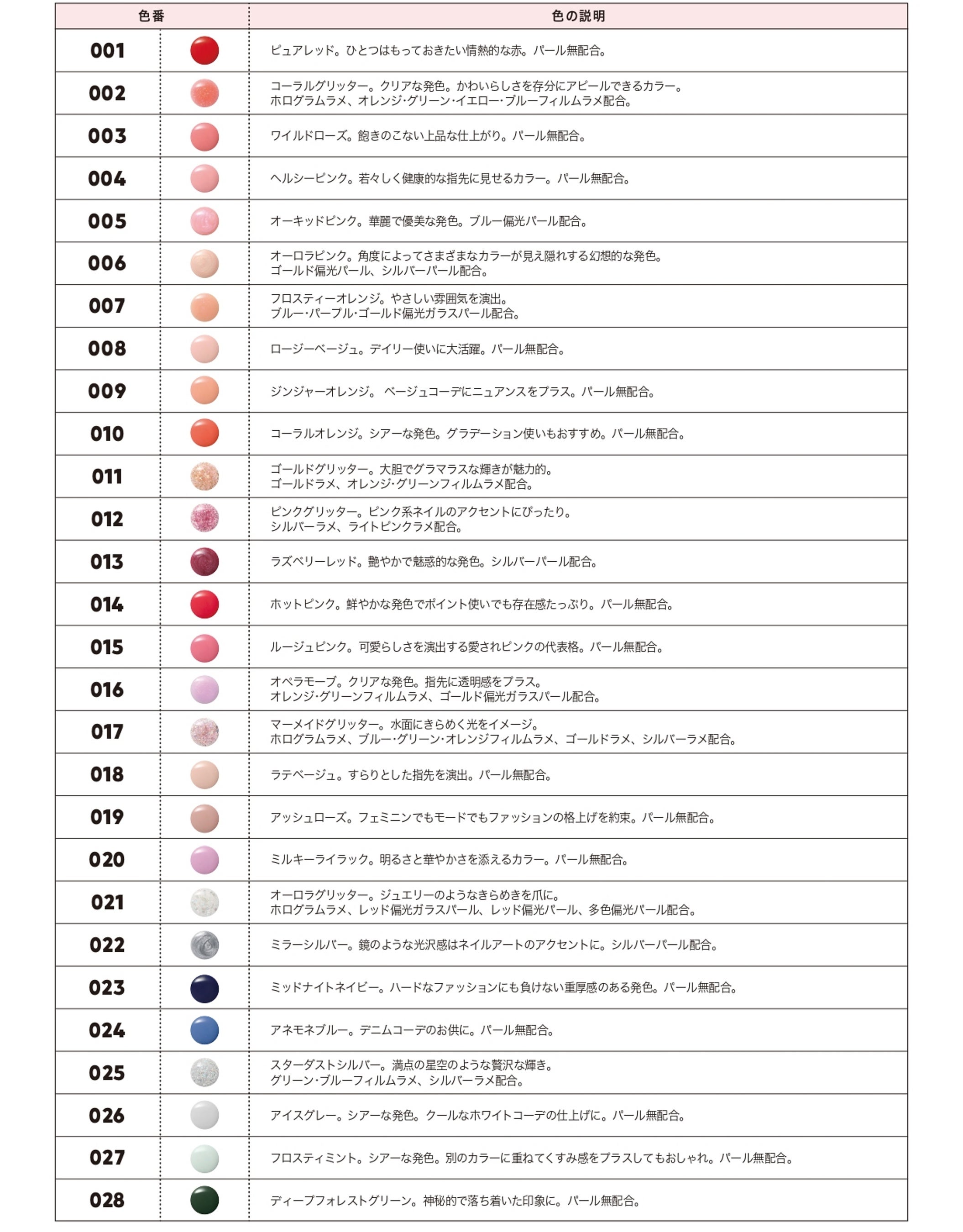 ポップなカラーやダークカラー、くすみカラー、ラメ配合など、メイクやファッションに合わせて選べる豊富なカラーバリエーション。