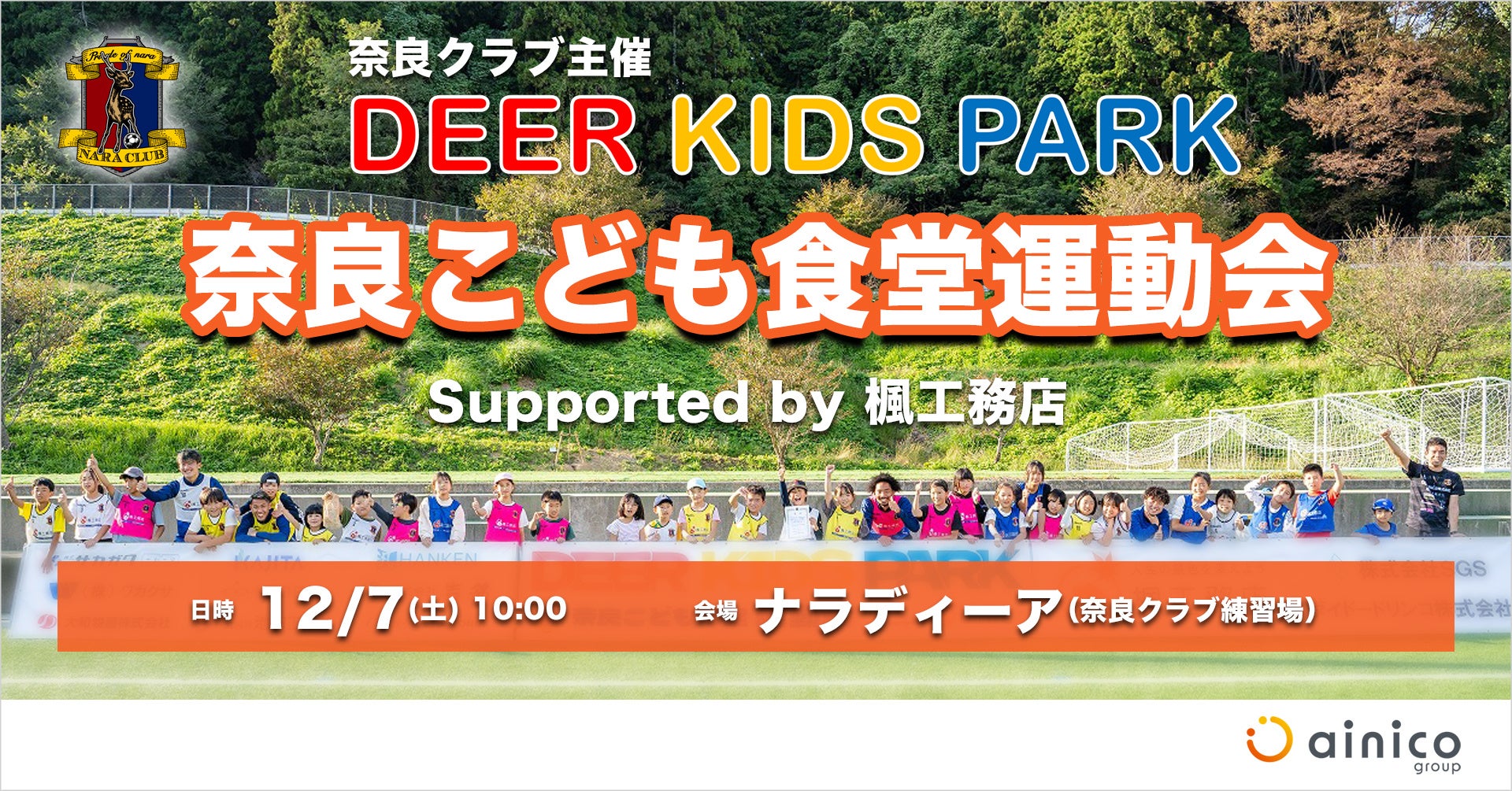 アイニコグループ株式会社(代表者:田尻 忠義、所在地:奈良県奈良市、以下当社)が展開する住宅事業ブランド「楓工務店」は、当社がプラチナパートナーを務めている奈良クラブが主催する「Deer Kids Park (読み方:ディアキッズパーク)奈良こども食堂運動会」に協賛します。