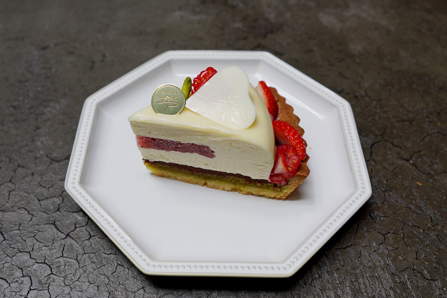 「女性が食べたくなるようなラブリーな見た目にしたく、私も大好きな組み合わせでお作りしました。一見甘そうに見えるタルトですが、ラズベリーの酸味とホワイトチョコレートの軽い食感が絶妙なタルトです。」(延命寺美也)