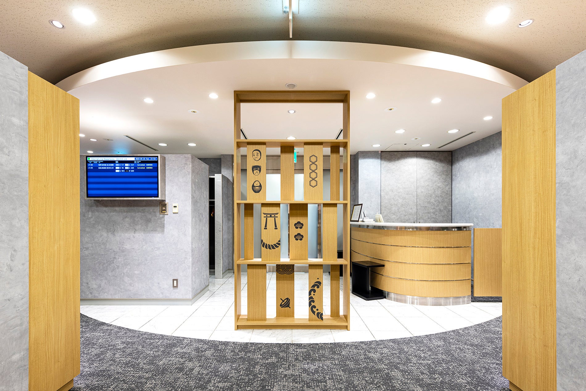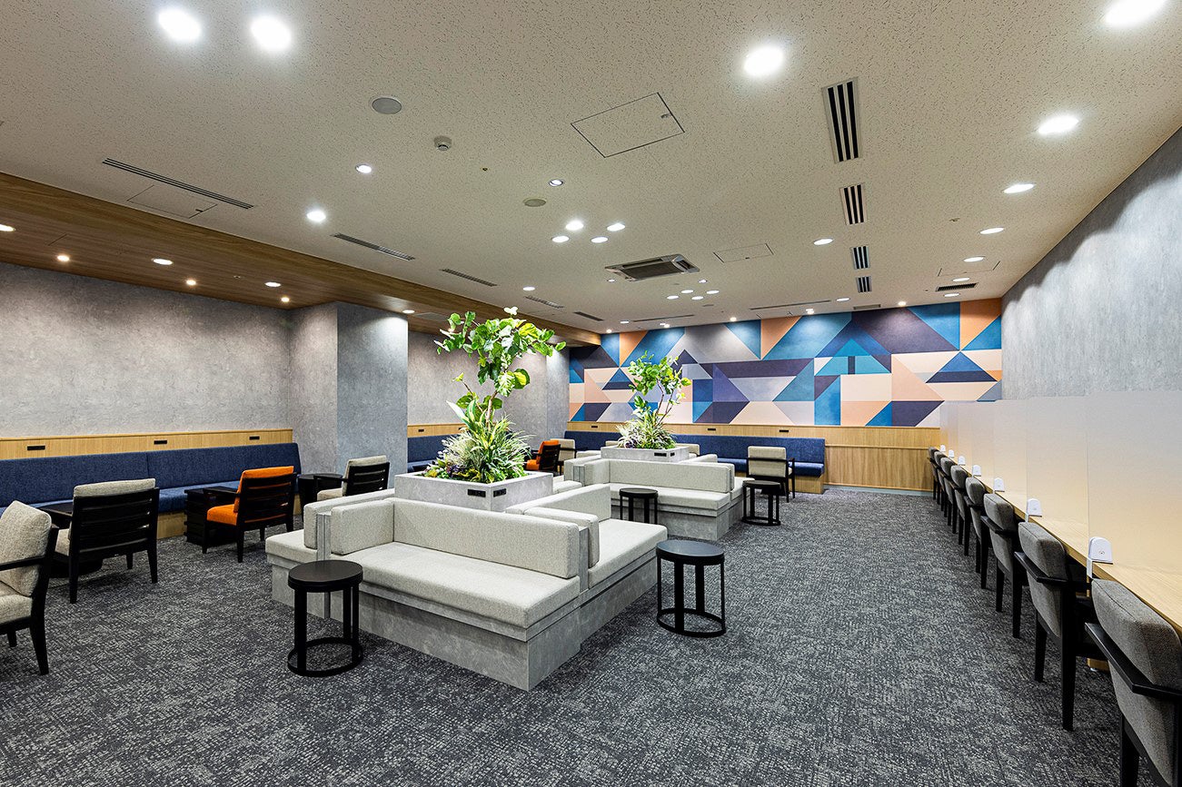 本計画の一環として、搭乗待合室に位置する「ラウンジTIMEインターナショナル」が、2023年6月1日(木)にリニューアルオープン。船場は「博多のおもてなし」をコンセプトに内装設計・施工を行いました。お客様が博多を発つ前の最後の時間で福岡の思い出を振り返っていただけるよう、博多織の代表的な献上柄をモチーフにした壁面や、ラーメンや祭りなど、博多をイメージしたグラフィックパネルを随所に散りばめた遊び心あるデザインとしています。