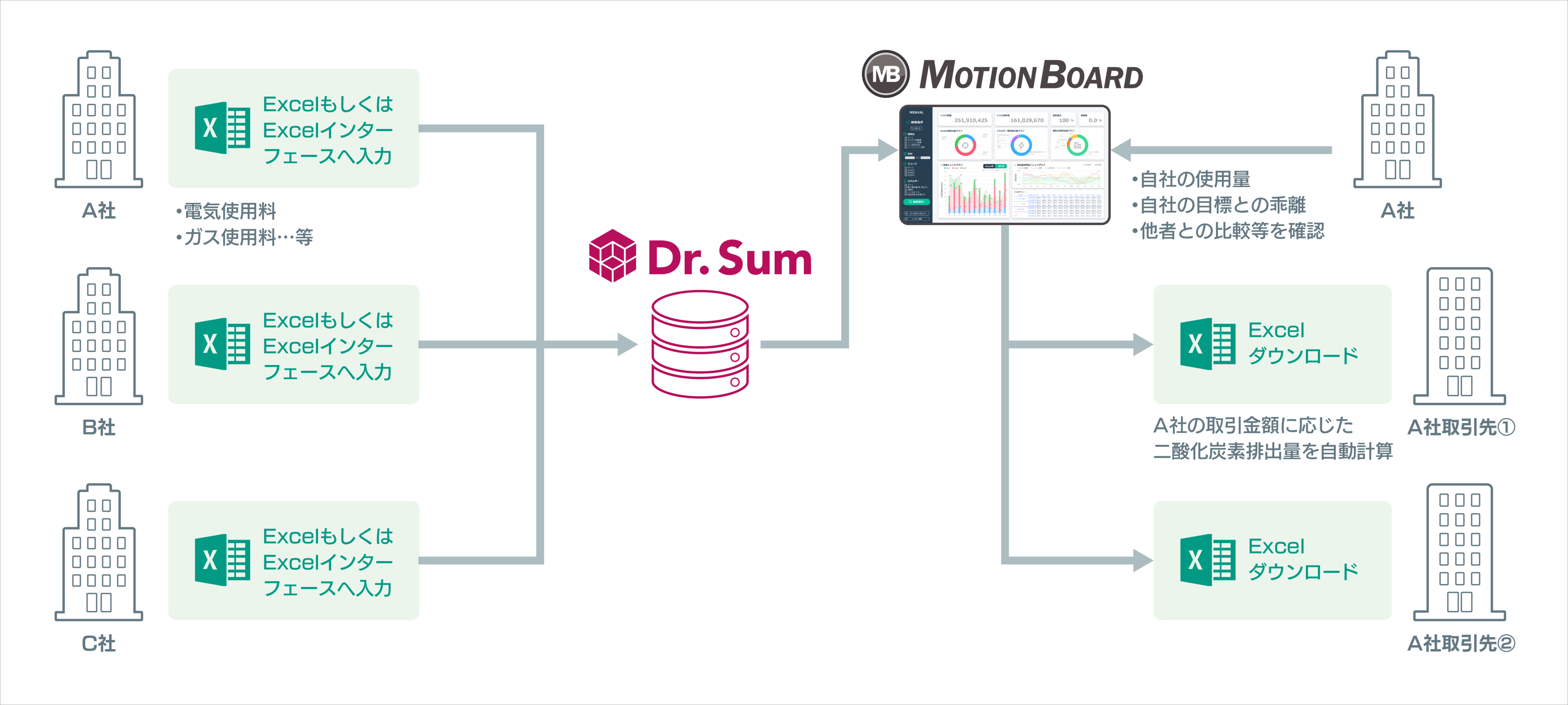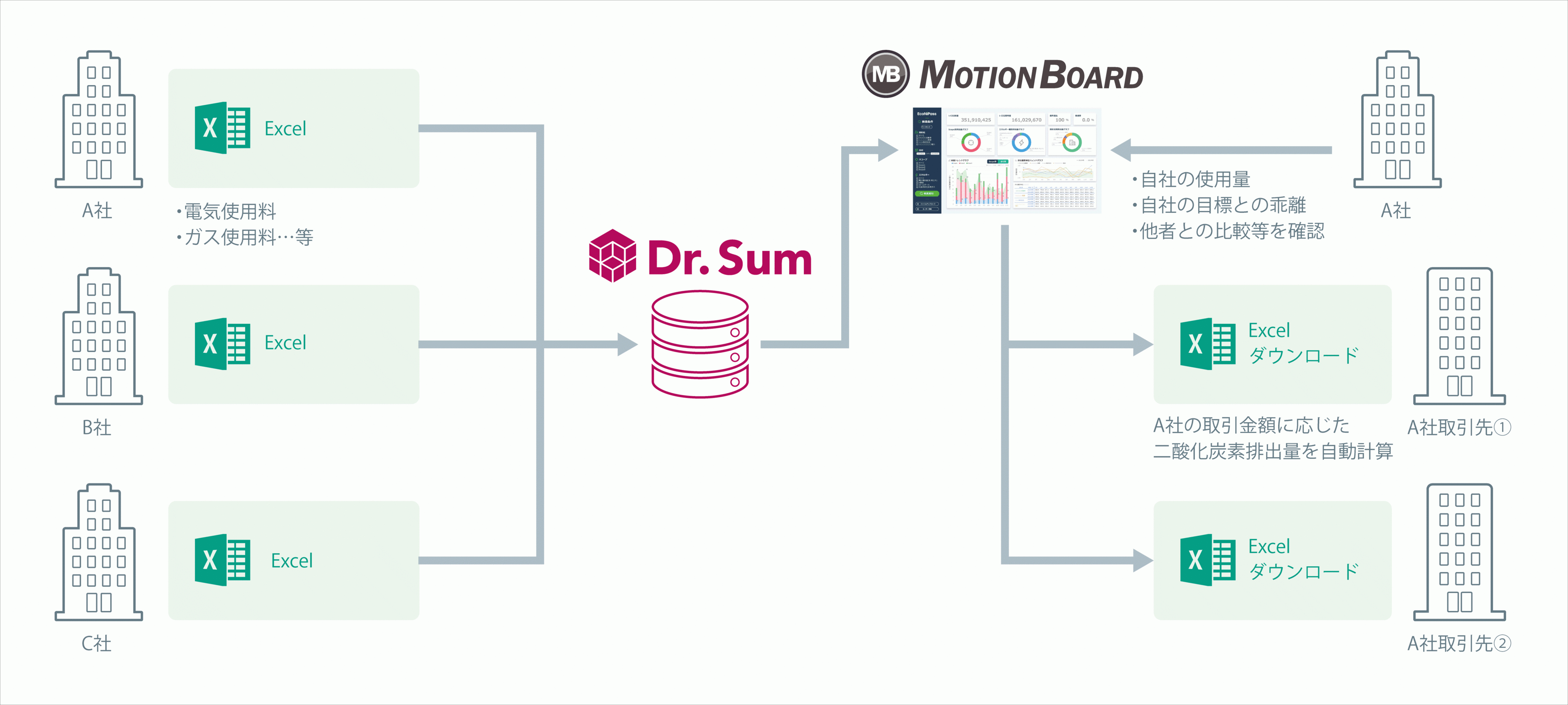「EcoNiPass」はサプライヤーと共にご使用いただくことで、自社のCO2排出量にサプライヤー各社のCO2排出量を自動的に連携※することができ、報告と集計の業務負荷を低減します。
