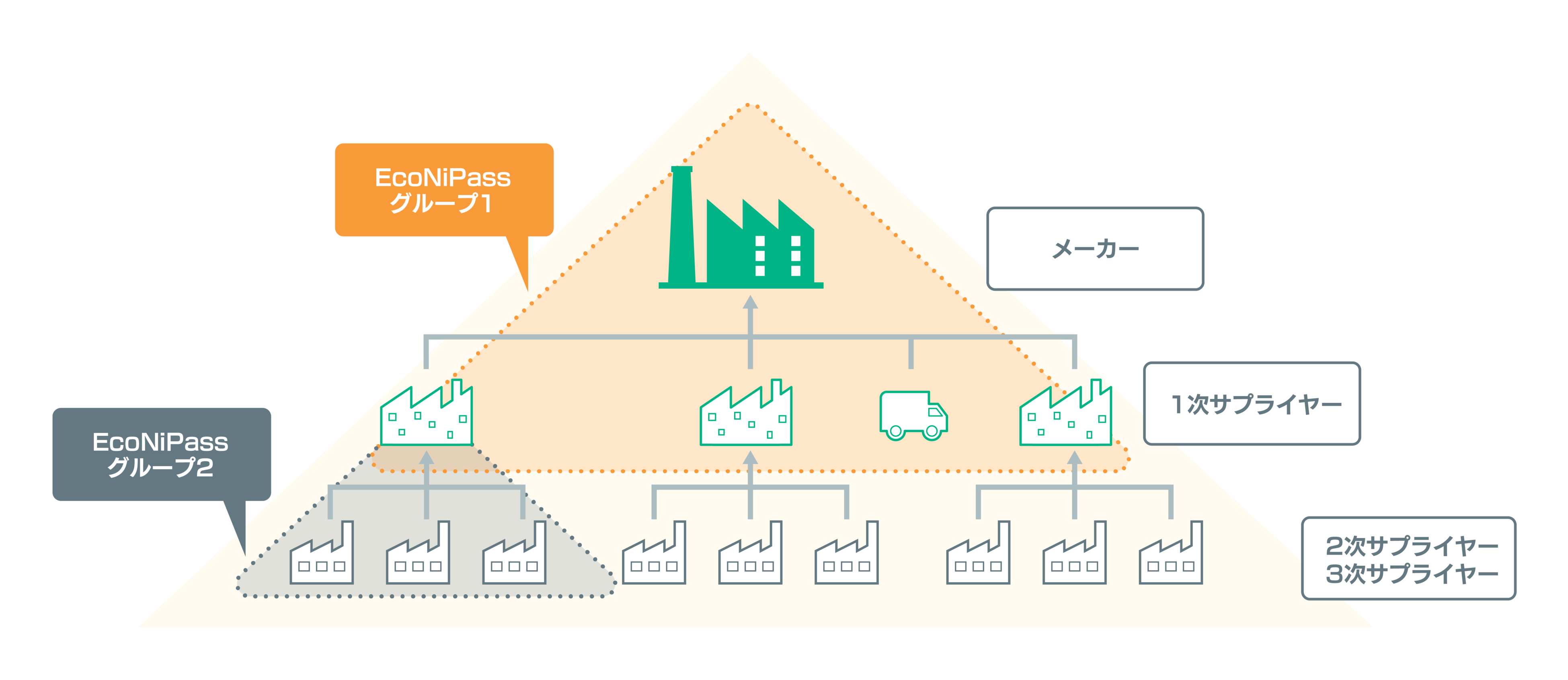 そこで、CO2削減に取り組む企業だけでなく、そのサプライヤーとも共同でご利用頂けるプラットフォームサービスとして「EcoNiPass」を開発しました。