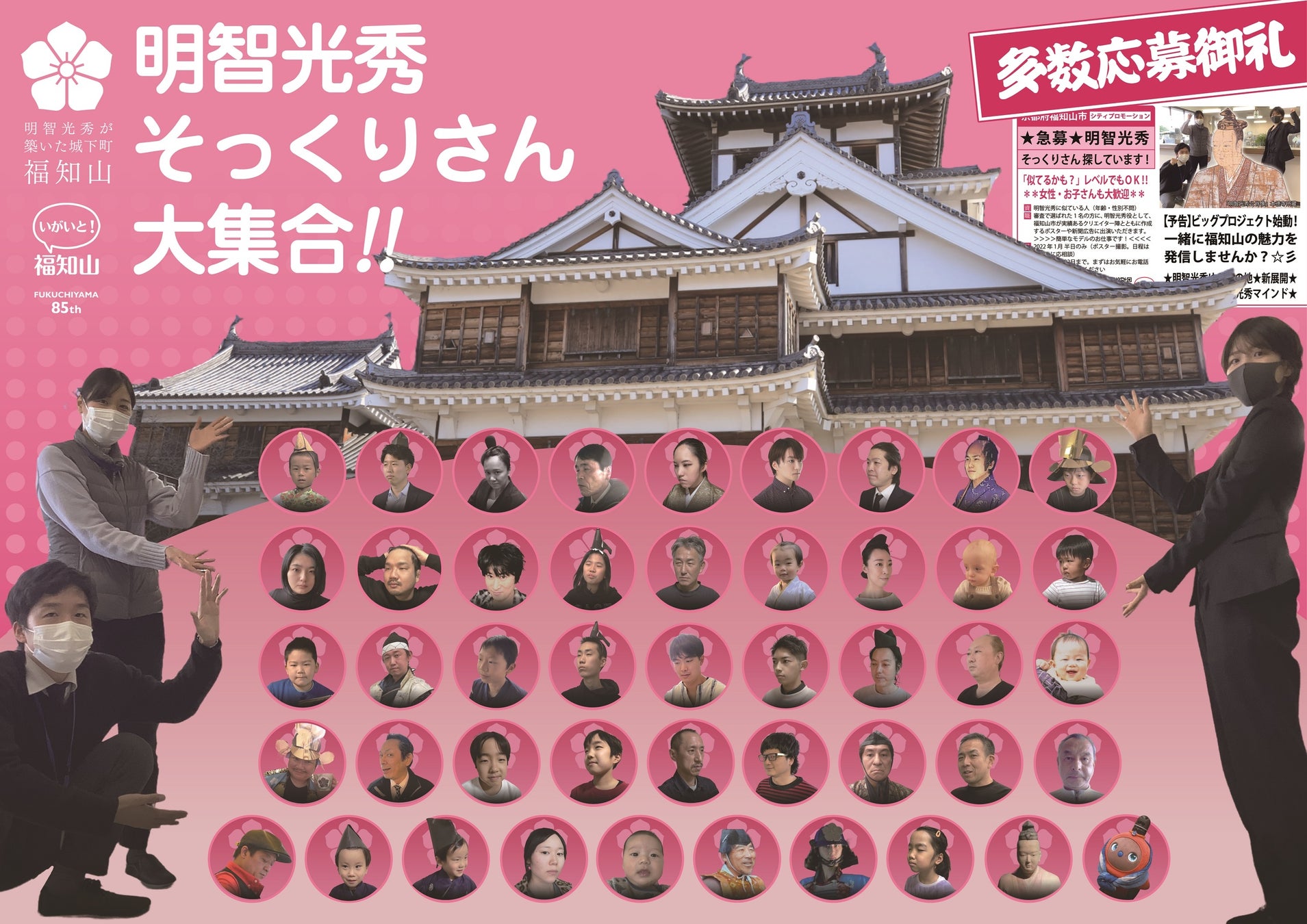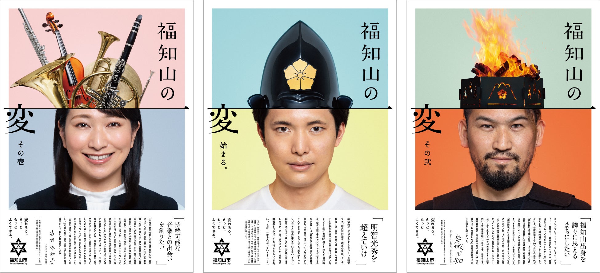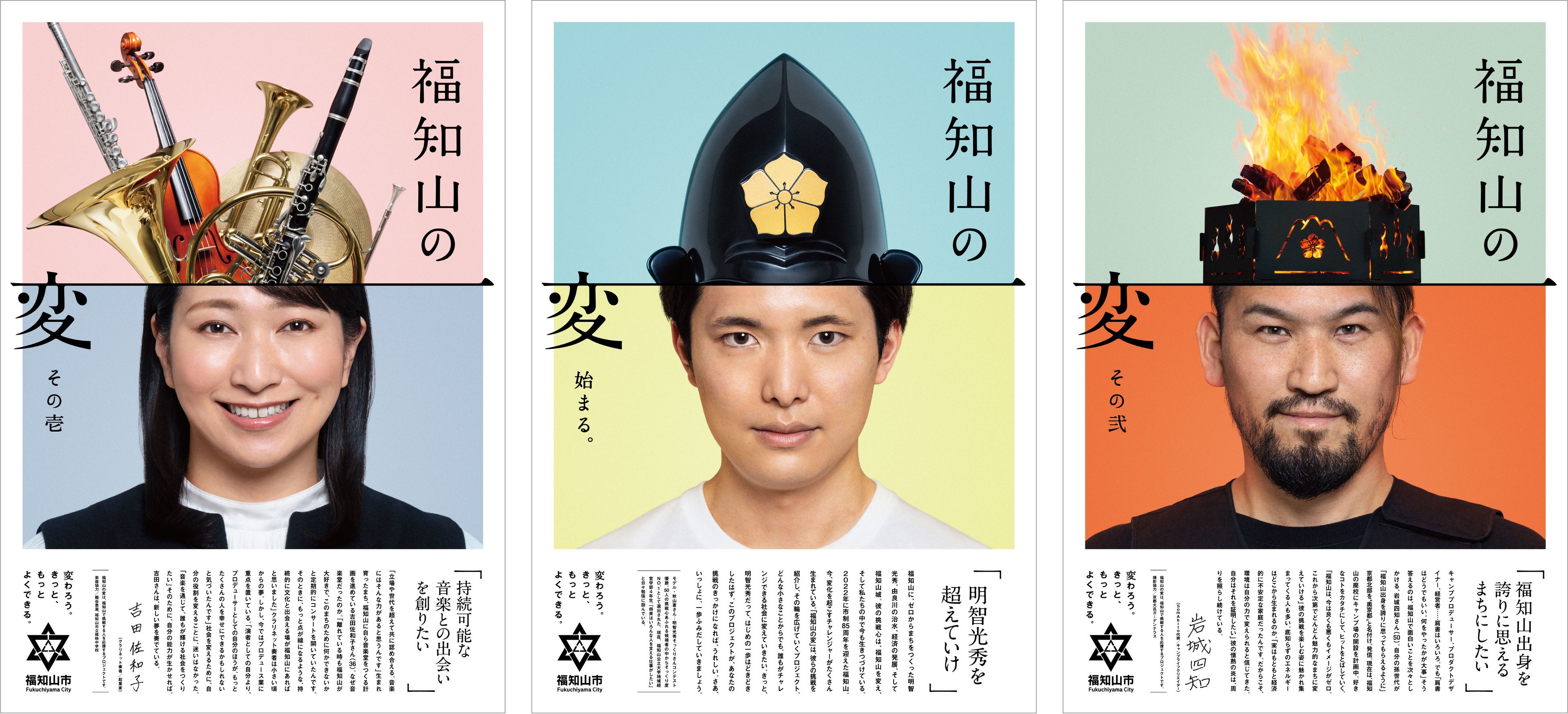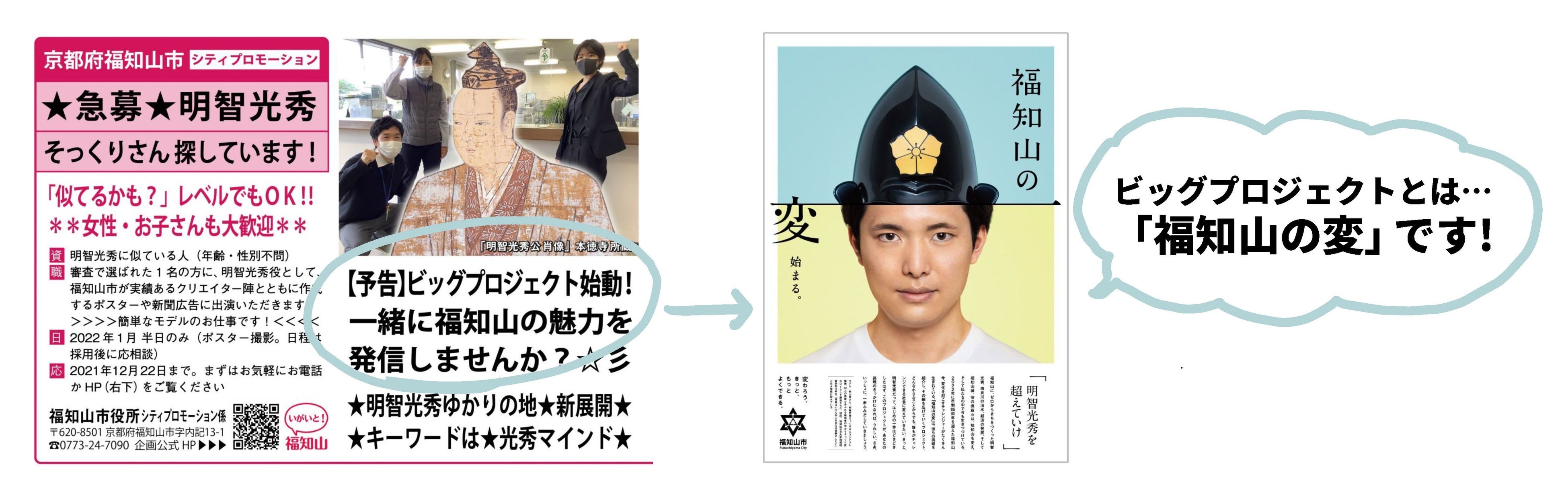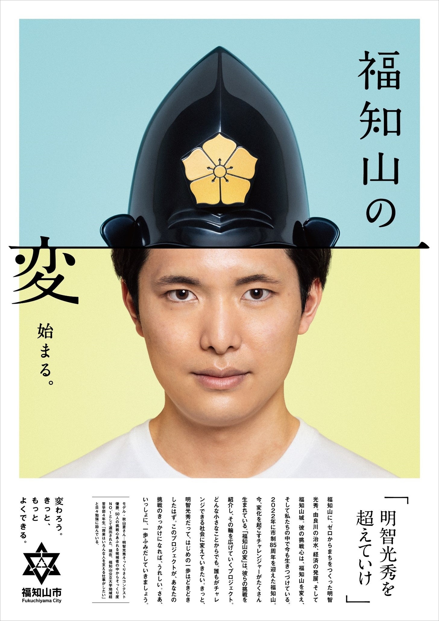 企画に先立ち、400年以上前に福知山の礎をつくった明智光秀と現在をつなぐキーパーソンとして「明智光秀そっくりさん」を公募。応募者50人の中から選ばれた福知山の大学生が登場する「福知山の変、始まる。」篇、そしてシリーズ本編となる「その壱 吉田佐和子さん」「その弐 岩城四知さん」のビジュアルを制作しました。応援の輪を広げるべく、地元新聞に全面広告を掲載し、光秀が築いた福知山城、福知山駅、図書館などにも順次ポスターを掲出。公式グッズとしてポロシャツも制作しました。そして「福知山の変」シリーズは、今後も続きます。ご期待ください。