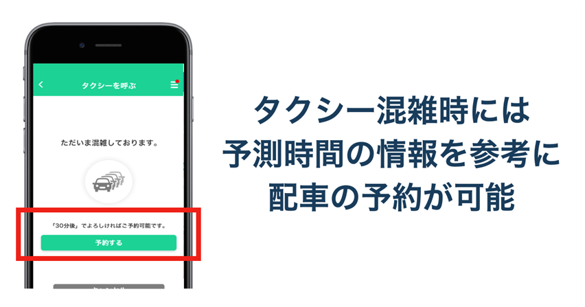これにより、利用者は時間をずらして何度も配車依頼をする必要が無くなり、タクシー事業者は「数10分先でも構わない」お客様の取りこぼしが無くなるという利点があります。