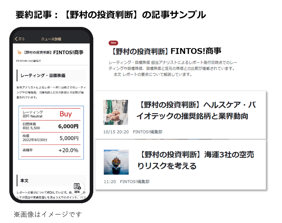 野村證券株式会社(代表取締役社長:奥田健太郎、以下「当社」)は、投資情報アプリ「FINTOS!」にて、2022年10月11日より、アナリストレポートの要約記事の配信を開始しました。