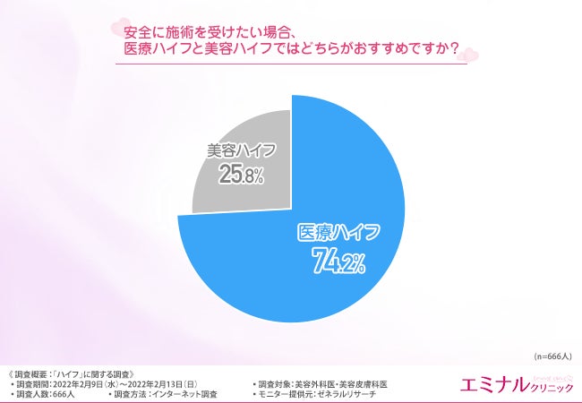 「安全に施術を受けたい場合、医療ハイフと美容ハイフではどちらがおすすめですか?」と質問したところ、7割以上の方が『医療ハイフ(74.2%)』と回答しました。