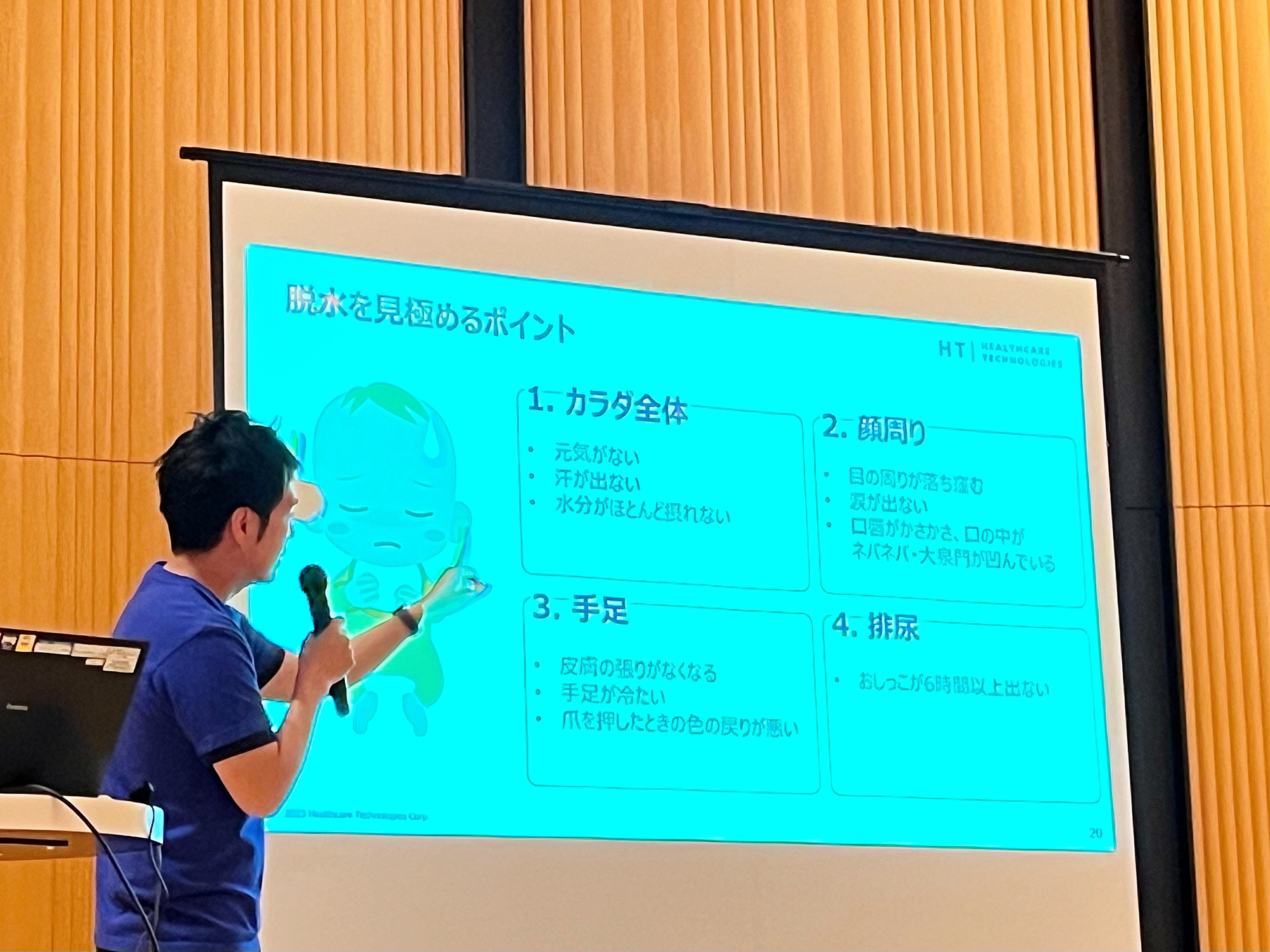 こどもの「ホームケア」について、発熱・下痢・嘔吐の対応、脱水の見極めと対処法についてお話しました。病気やケガのこどもの家でのケア方法「ホームケア」は、家での世話だけでなく、受診の判断も重要なポイントになると言います。救急外来の受診理由1位である“発熱”や、続いて多い“下痢・嘔吐”についての、症状に応じた具体的な対応と、受診を判断する目安を紹介しました。また、夏の感染症について「いわき市でもヘルパンギーナが流行し始めている」と言及。加えて、手足口病やプール熱の流行も予想されるこれからの時期、脱水症状のケアが必要であると述べ、顔周りや手足を確認することによる脱水を見極め方や、経口補水液を使った処置の方法、経口補水液を選ぶ際のポイントなどもレクチャー。HELPOにはこどもの解熱剤や下痢止めの服用に関する相談も寄せられると紹介しました。