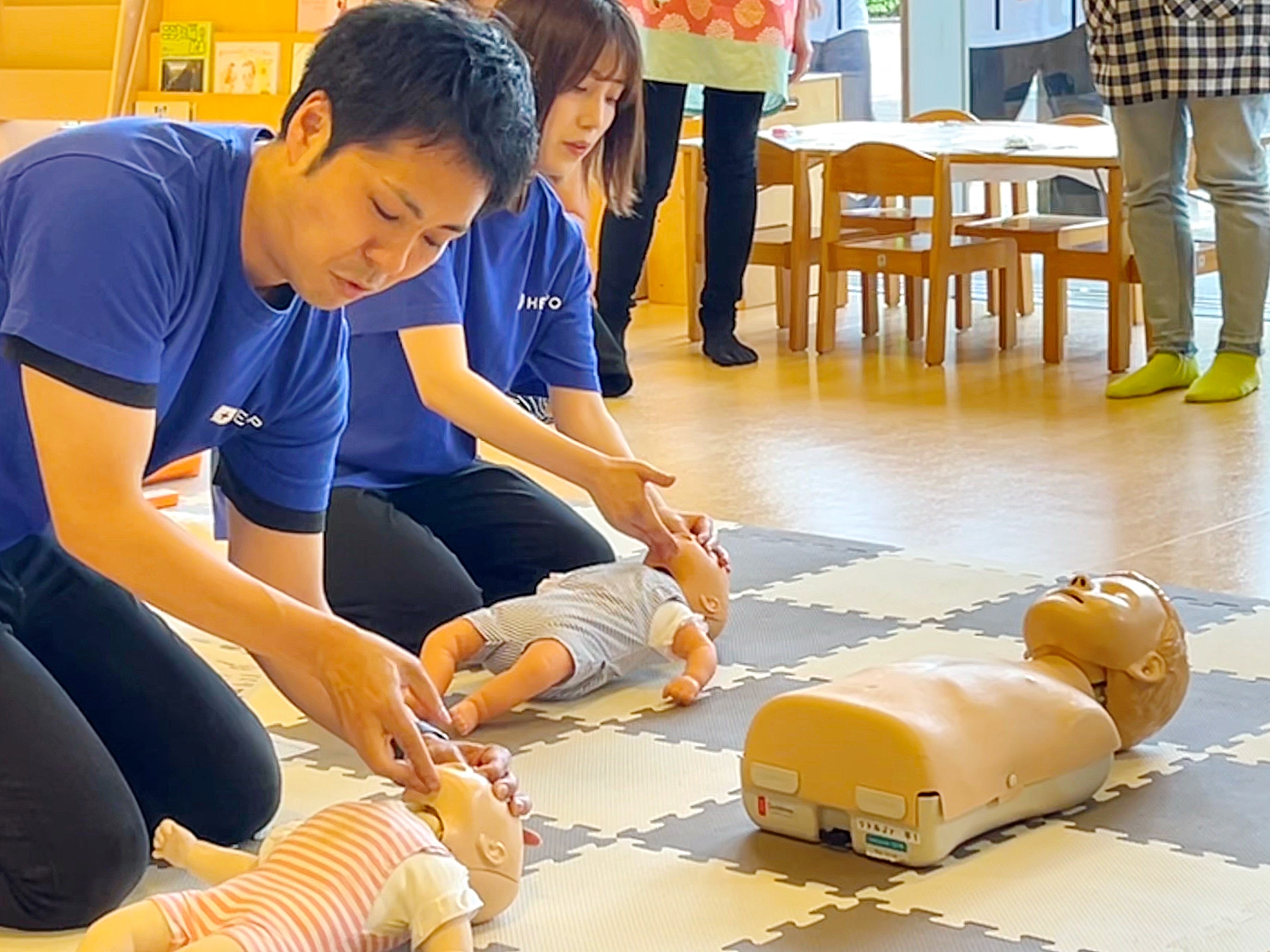 また、当日はキッズスペースにて「子どもの一次救命レクチャー」も実施。参加者に対し、お子さんにもしもの事があった場合の胸骨圧迫や人工呼吸の方法や、AEDの使い方をレクチャーし、一緒に実践しました。
