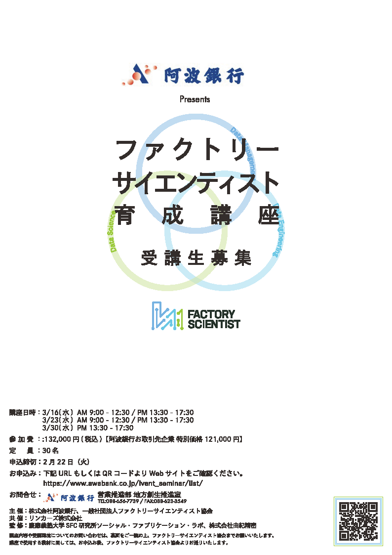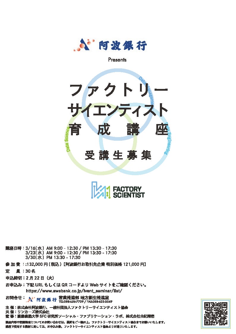 阿波銀行(頭取 長岡奨、本店:徳島県徳島市)は、一般社団法人ファクトリーサイエンティスト協会(代表理事 大坪正人、本社:東京都中央区)およびリンカーズ株式会社(代表取締役社長 前田佳宏、本社:東京都文京区)との共催により、「ファクトリーサイエンティスト育成講座」を開催しますのでお知らせいたします。