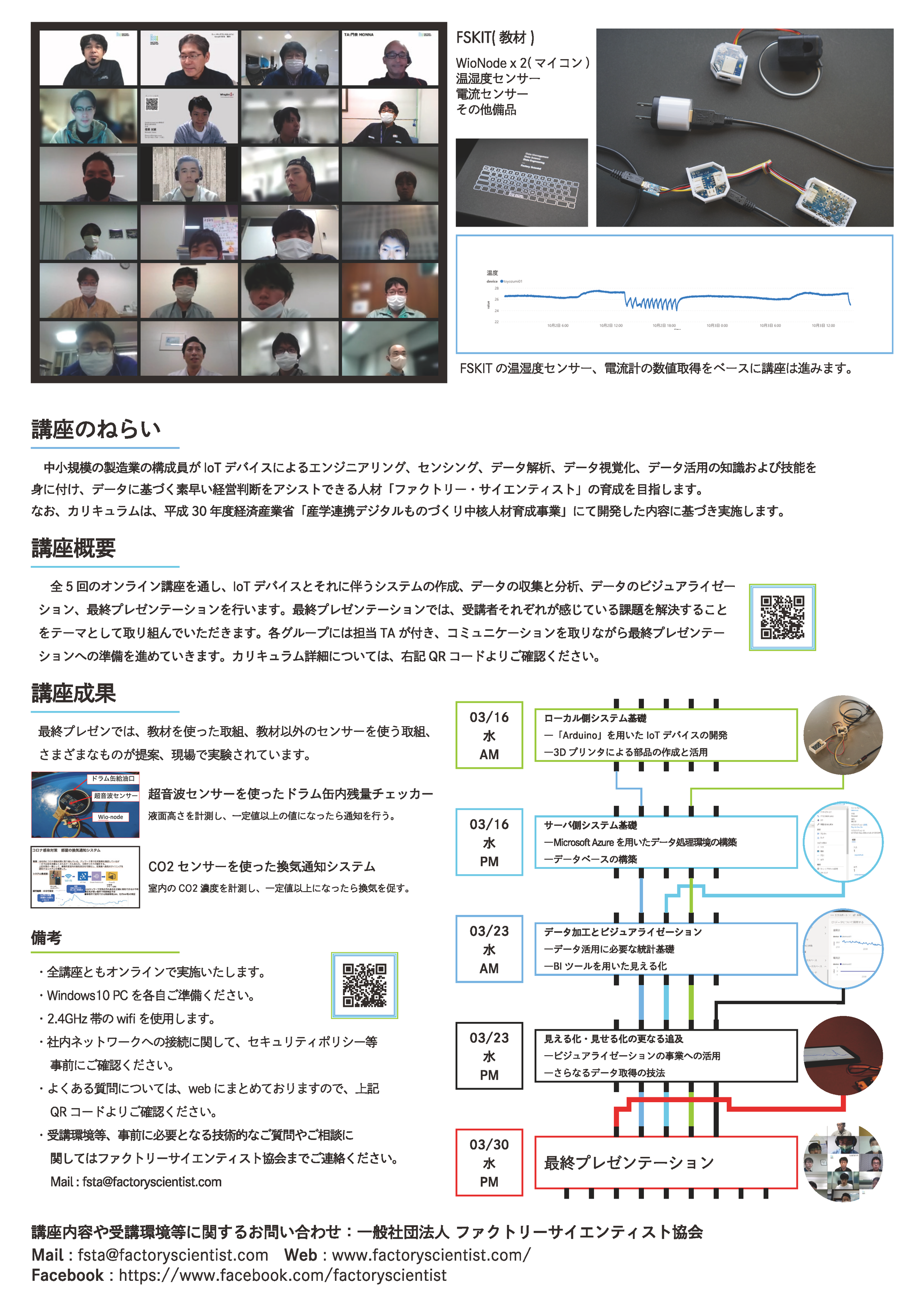 全 5 回のオンライン講座を通し、IoT デバイスとそれに伴うシステムの作成、データのビジュアライゼーション、最終プレゼンテーションを行います。講座修了後、「ファクトリーサイエンティスト」の認定資格を取得、当協会への入会によりセミナーや会員同士のコミュニティによる情報提供が受けられます。